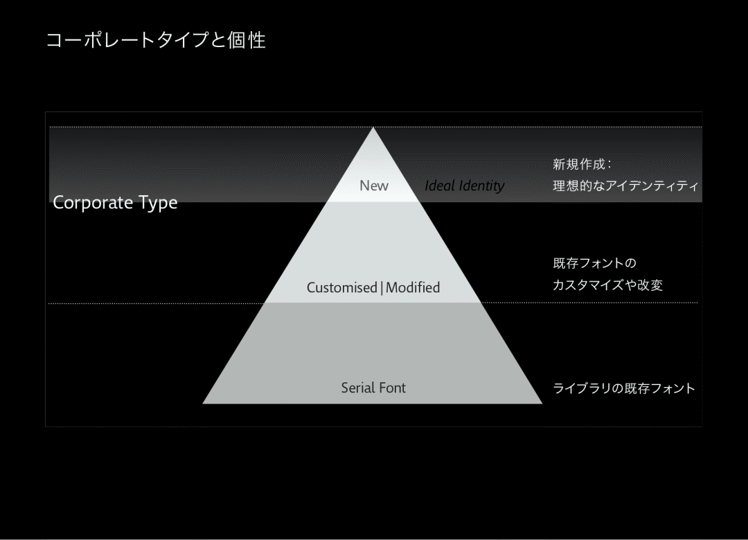 开发主要有3种方法。最基础的方法是从金字塔※最底层的程序库现有字体中选择。从Monotype现有的大约3万字的欧文字体中,选出符合形象的字体直接使用。但是,挑选的这些字体有可能别人也在使用,不能算是独一无二的企业字体。相反,为了突出品牌的独创性,还有金字塔顶端的全新制作的方法,从零开始创作草图。采用这种方式,可以设计出独一无二的理想字体,但也存在耗费时间和成本的不利之处。因此,可以考虑采用金字塔中间位置的定制和改良(modified)的方法。从现有字体中挑选字体,并在此基础上进行改良,既确保了字体的个性,又无需耗费时间即可制作出企业字体。