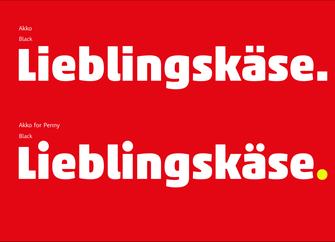 我与品牌代理合作,为德国大型连锁超市Penny制作了企业字体。对我制作的Akko字体进行改良,形成了Akko for Penny。要说哪里不同的话,配合Penny标识的标志性黄色圆点,应该为点的地方全部设计成了圆形。具体来说,就是把小写字母“i”和“j”、德语中的重音等符号全部设计成圆形,把最后的圆点设计成黄色。分为4种粗细,有普通的无衬线字体(Sans-serif)和一种在日本称作圆角Gothic的“Rounded”字体共2种类型,根据需要分别使用。