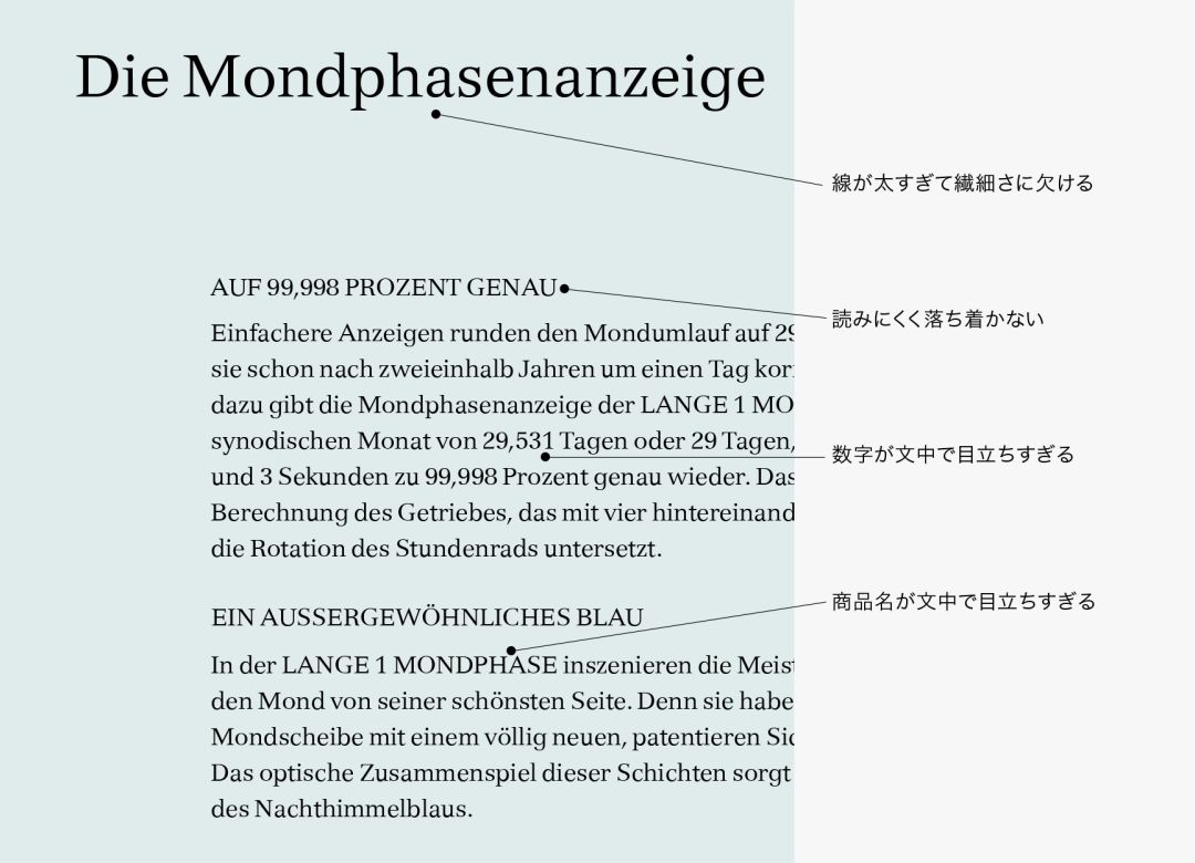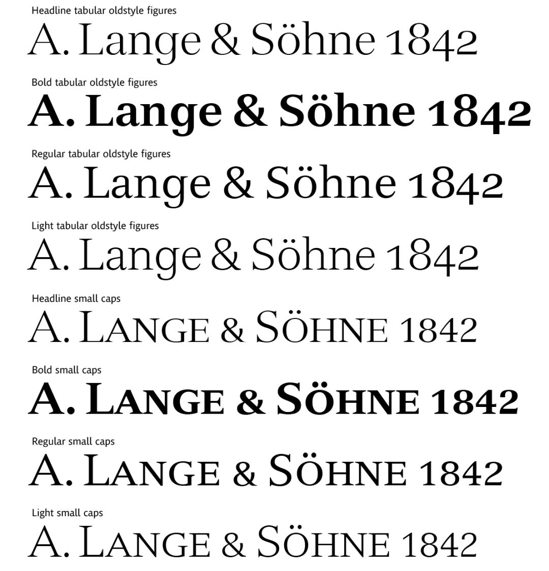 我还参与了将基地设在德国的高档钟表制造商A. Lange & Söhne公司的产品目录字体开发工作。那是以Versailles为基础字体开发的Versailles for ALS字体。从“l”和“g”就能轻易分辨出来,将上下略微加长,突出了高雅气质。