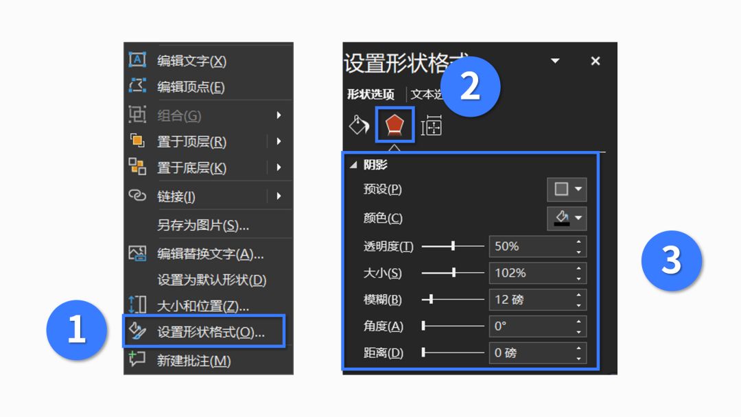 选中所有的形状(圆形跟矩形),再右击其中任意一个形状,点击【设置形状格式】——【效果】——【阴影】——调整一下参数。