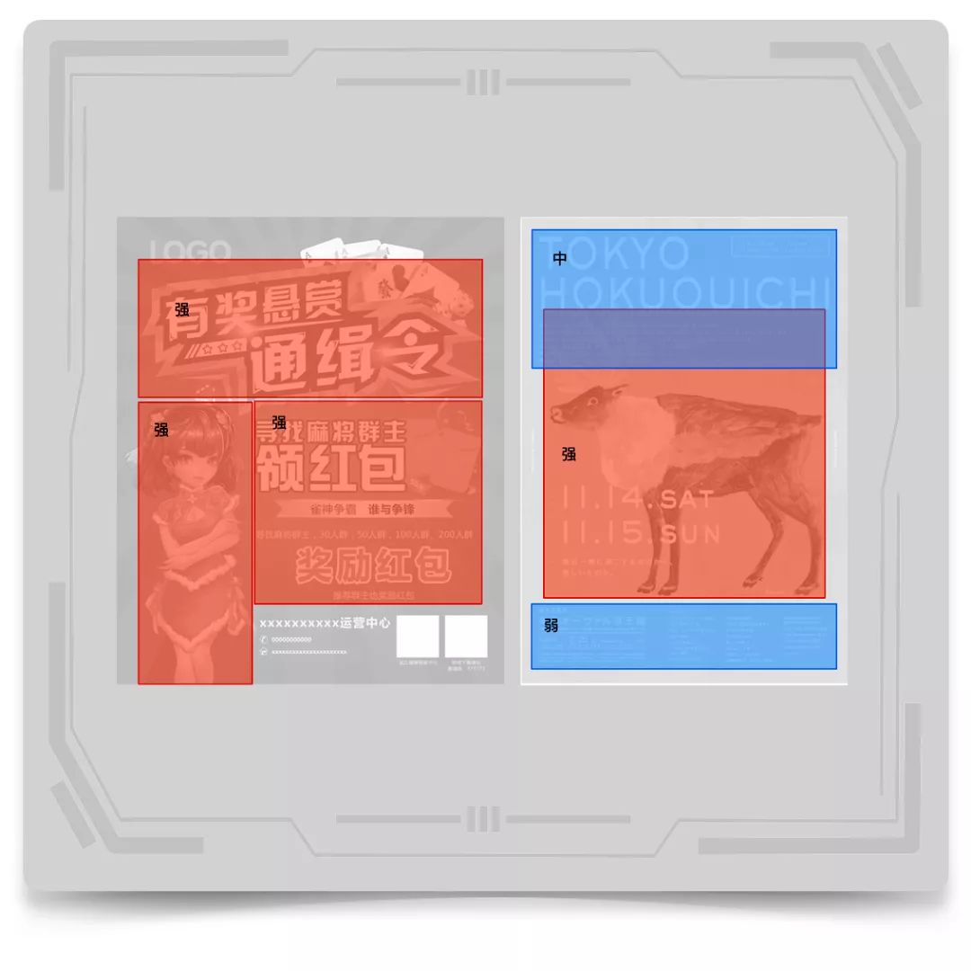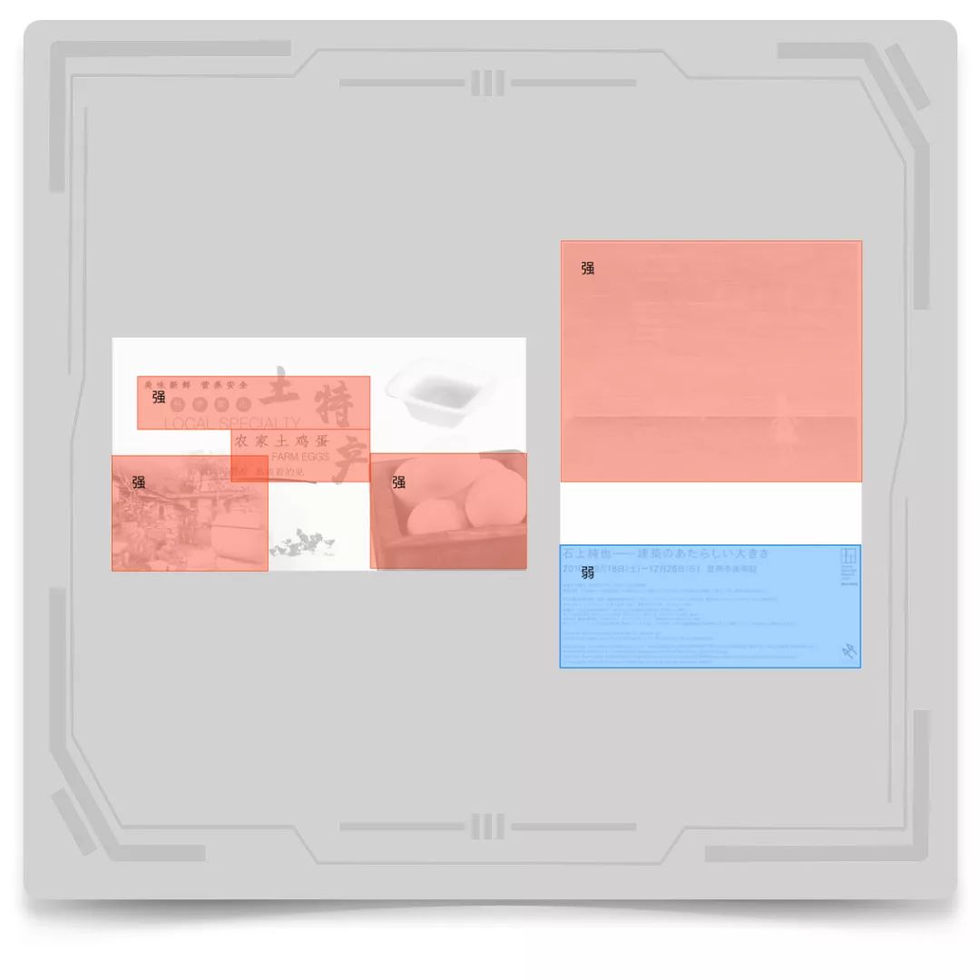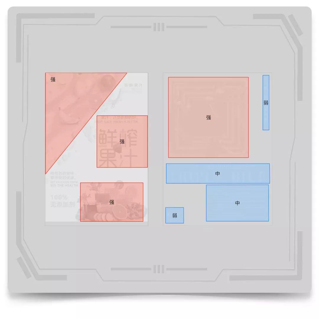 三组元素都呈现出较为抢眼的属性,并且其中有两组元素视觉面积几乎相等。