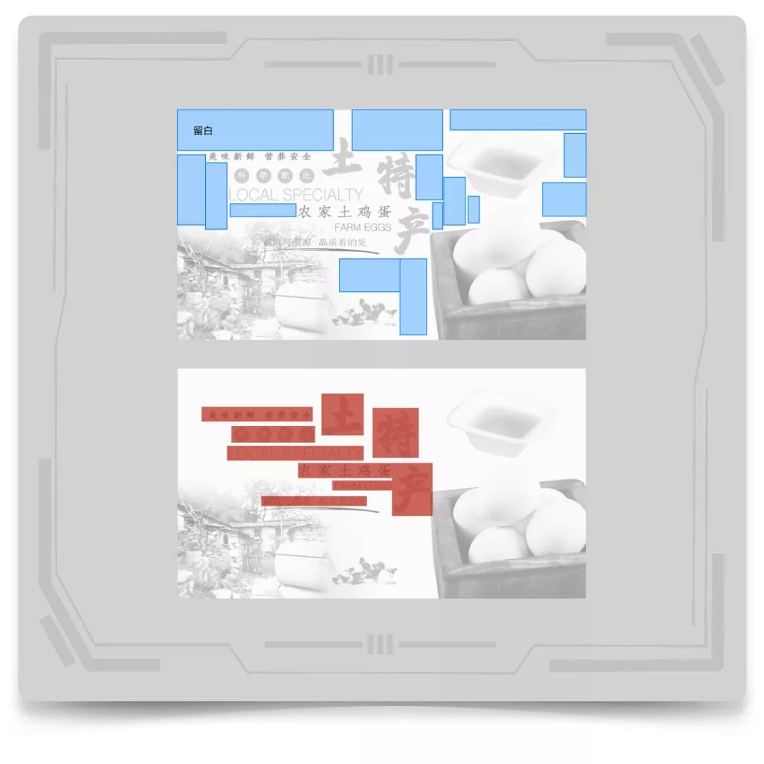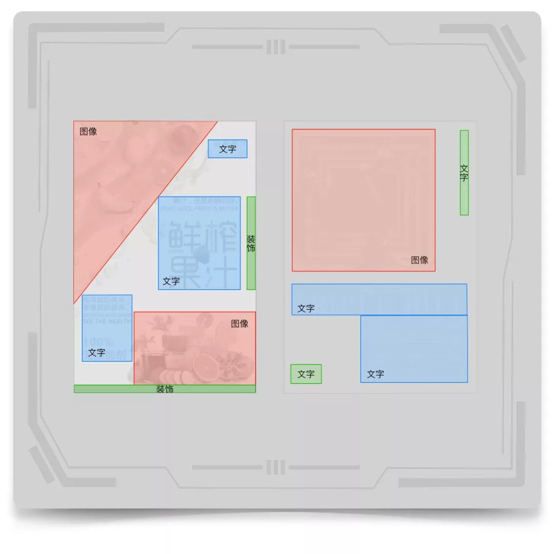 我们首先来分析一下这个画面,很明显,它在设计上存在着一些不足。我们从这个版面中能够看出哪些信息呢?首先它是由左上和右下两个面积差不多的图像,和这个中间的文字构成。边缘部分还有两个装饰性的色块。