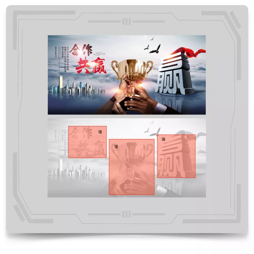 画面中左边文字,中间的奖杯和右边的赢字都很大很抢眼,使得画面比较乱。