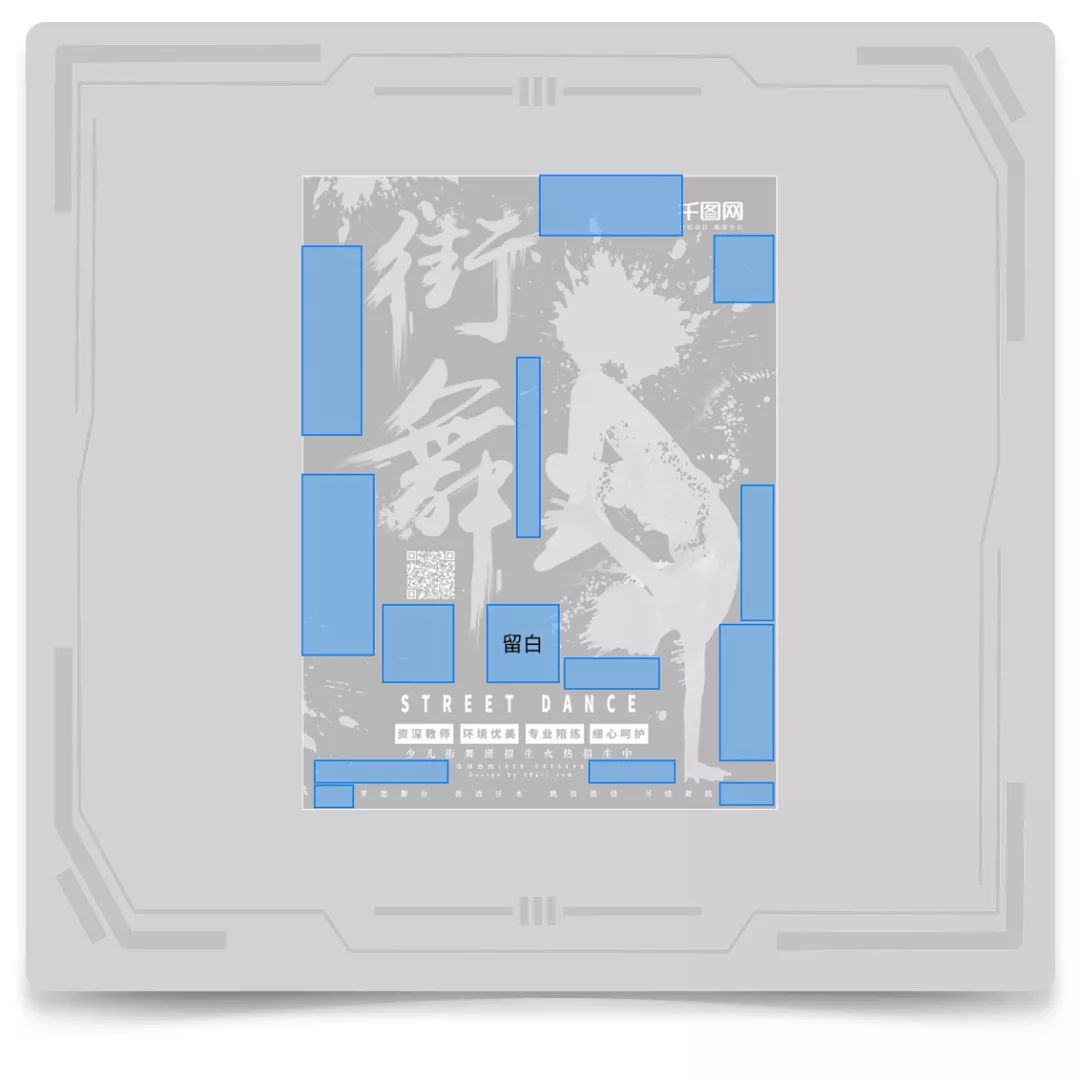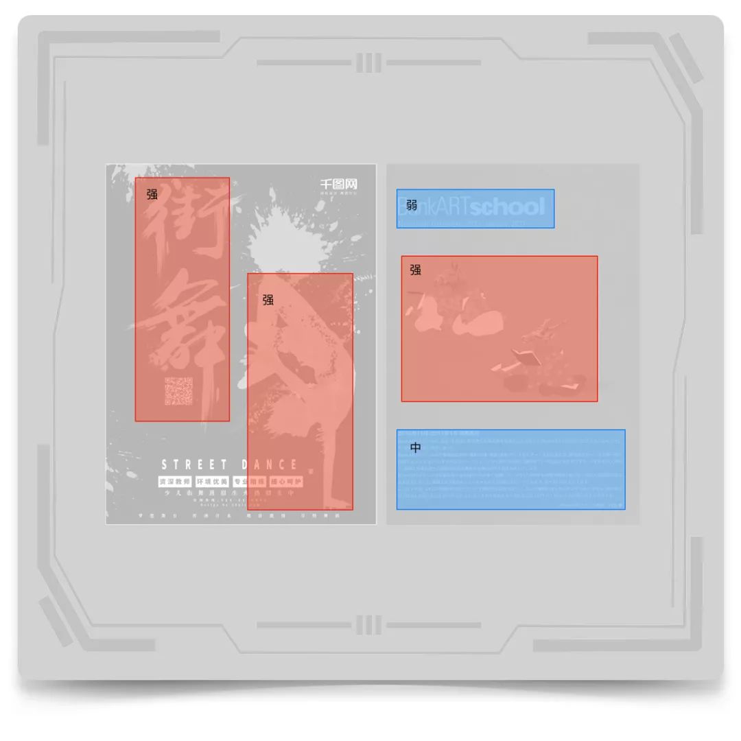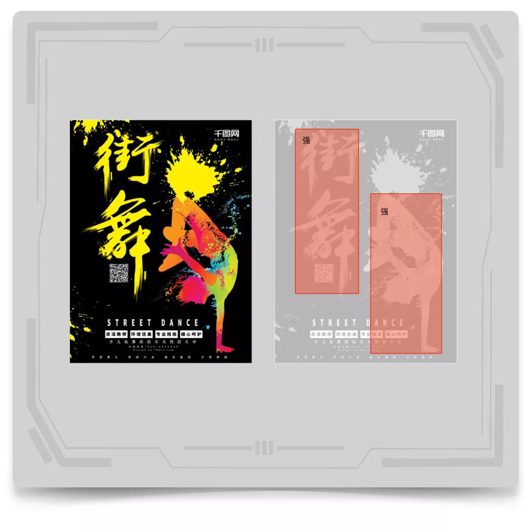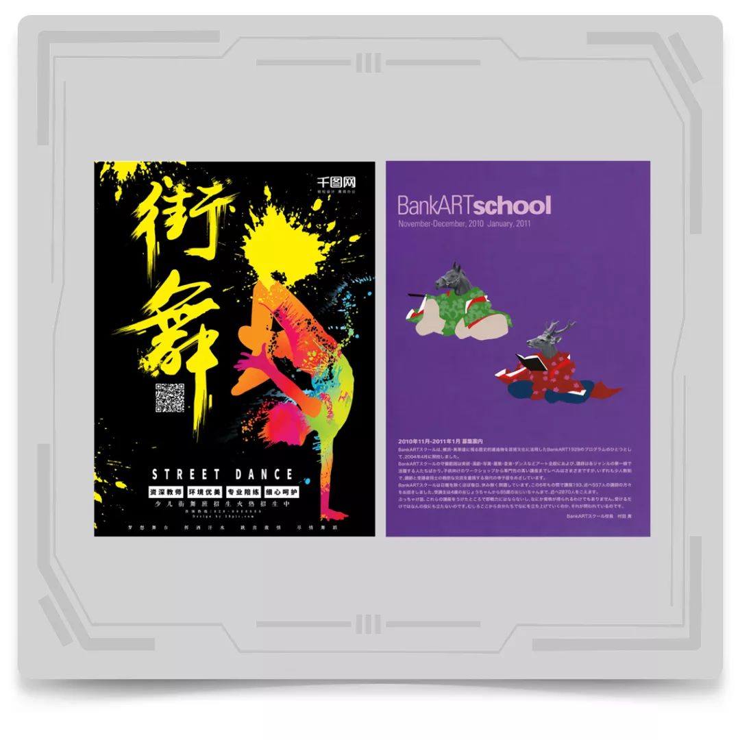 这个版面呢,街舞两个字用了书法字和抢眼的黄色,而下面的舞者用了炫酷的彩色,也十分抢眼,版面中出现了两个相互争夺视线的元素。