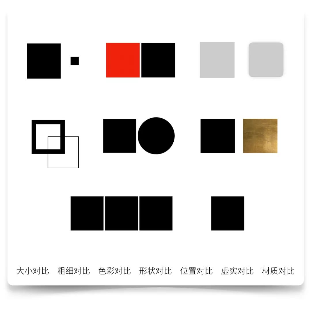 在版式设计中我们可以通过很多技巧去凸显这个焦点元素,比如大小对比;粗与细之间的对比。也可以理解成浓与淡之间的对比;颜色上的不同一样可以将焦点突显出来;形状也是一样;或者也可以通过位置上的变化去强调焦点;虚和实之间的对比也是如此;或者是不同材质与肌理之间的反差都可以起到对比的作用。