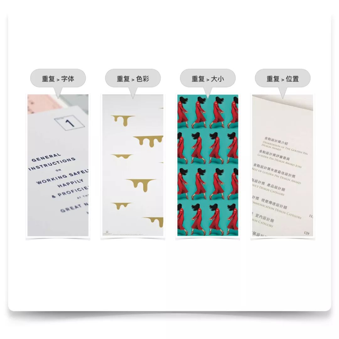 重复相同的属性就是创建规律的一种方法,只需要在版面中重复相同的字体、色彩或者是位置和大小,就能创建出一种模式。