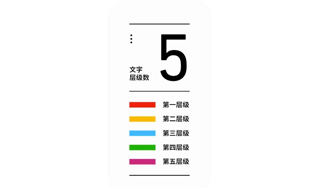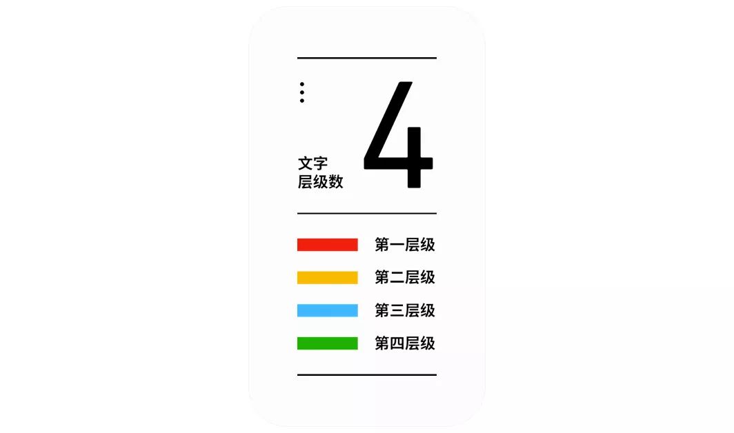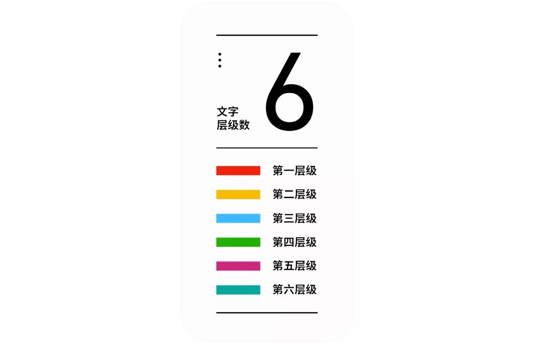 随着对于信息层级这个问题的进一步深入,我们多少会有所疑问,在内容允许的情况下,层级可以无限划分下去吗?我们都知道人眼在看文字时,如果文字缩放的太小,就会有让人看不字的情况出现,所以版面中是存在一个最小字号的。而版面的尺寸通常是有限的。那么一个版面中最多能出现多少个层级呢?接下来我就带领大家一起去数一数。