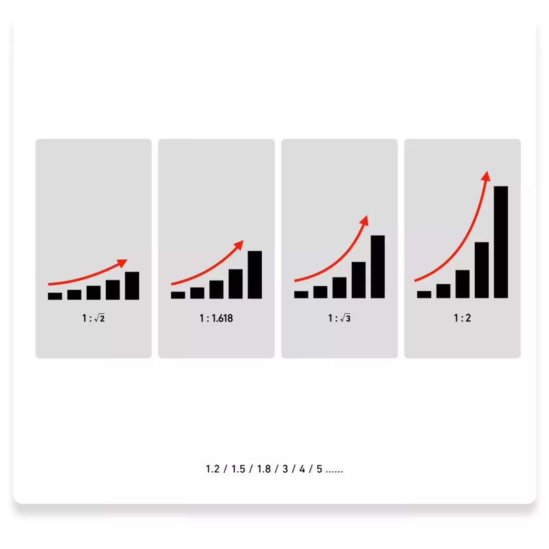 在一个版面中,我们将元素大小之间的比率称为跳跃率。层级之间大小对比的幅度越大,就代表跳跃率越高。版面会呈现出活泼,大气,直接等气质。