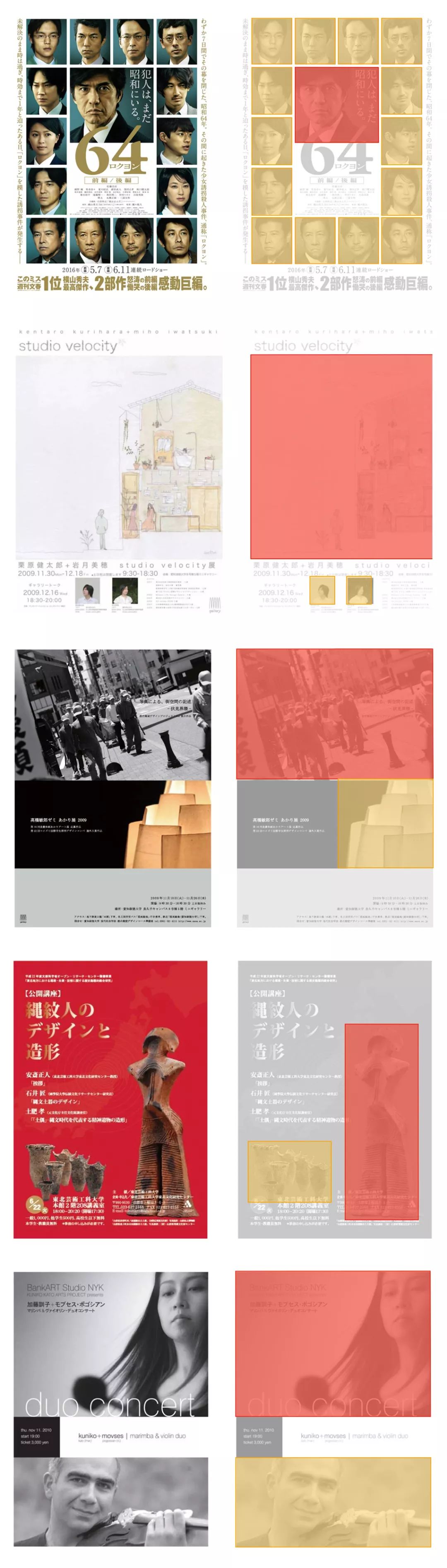 经过这一轮的分析,我们大致得出了以下结论,在那些不成熟的作品中,普遍存在两个或两个以上,视觉面积差不多的元素。而成熟的作品一般只有一个最大的元素,在视觉面积上,元素呈现出了依次递减的趋势。不成熟的作品中,色彩与特效被滥用,一个版面中经常会出现最少4到5种颜色。而相对成熟的设计作品,对于色彩的运用相对克制,一个版面通常不会超过三种颜色。不成熟的作品中,留白与对齐都显得很零碎,给人一种非常凌乱的印象。而在成熟一些的版面中,元素相互对齐,版面所产生的负空间也会相对更加完整。