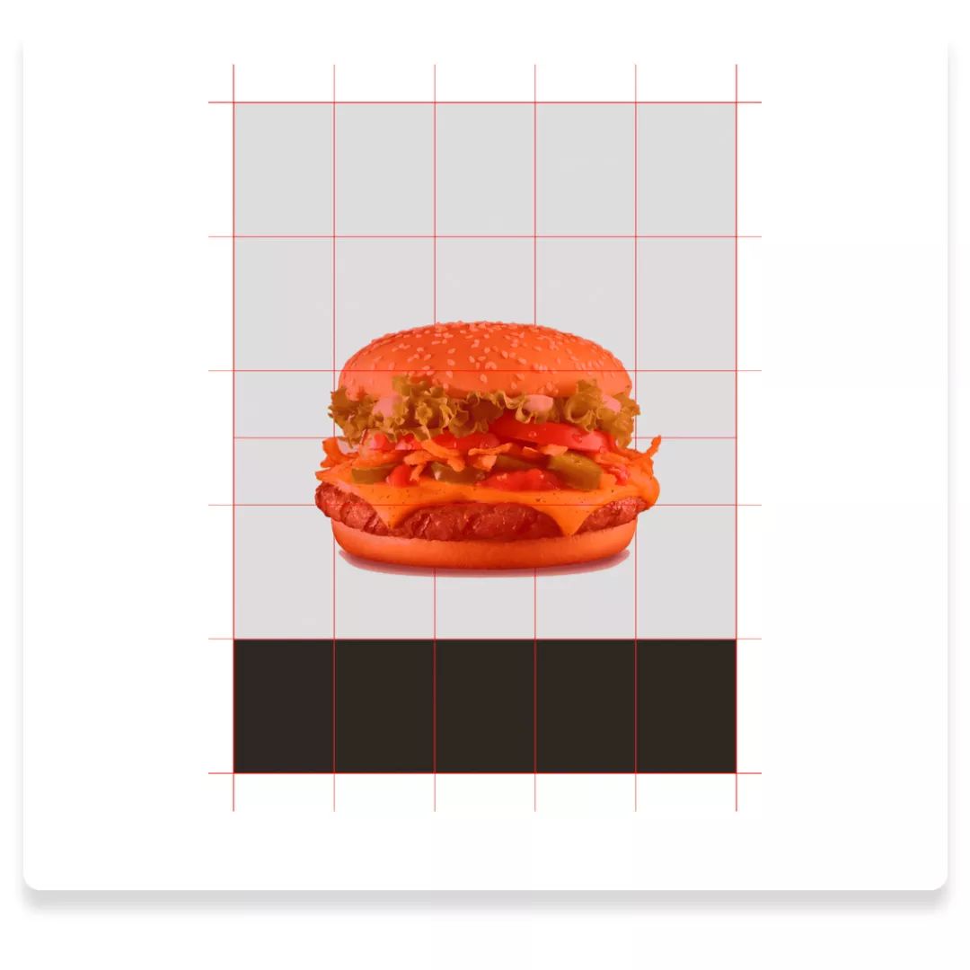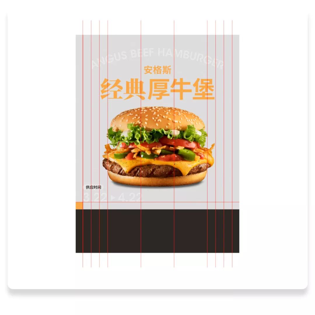 首先采用上下结构的构图,将画面横向分为5栏,最下面一栏添加色块。竖向分五栏,将主体汉堡占中间三栏放于版面中心。汉堡在画面中占了足够大的面积,使得主体显得十分醒目。