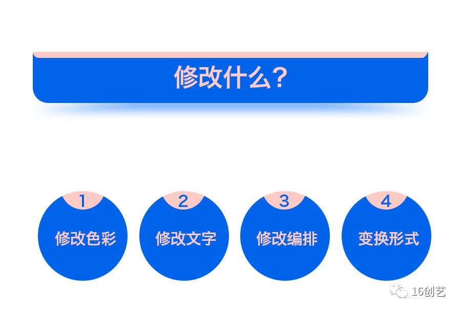 当弄明白为什么要改之后,就可以根据需要进行修改,而修改则完全是基于设计者对需求的理解和视觉表现,也是具体到某个元素的执行者和表现者,通常情况下在执行层面遇到的问题最多,同一个方向下的视觉表现就有前变化的效果,而具体要改什么才能实现目的是众多设计者摸不着头脑直接关键所在,通常情况下要改的内容主要可以集中在4个方向上面;