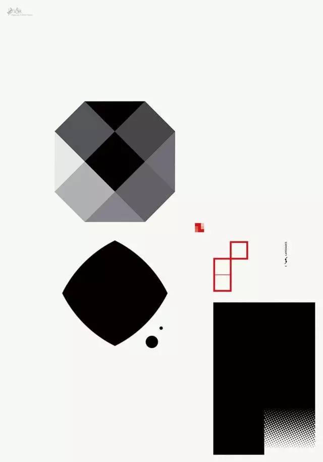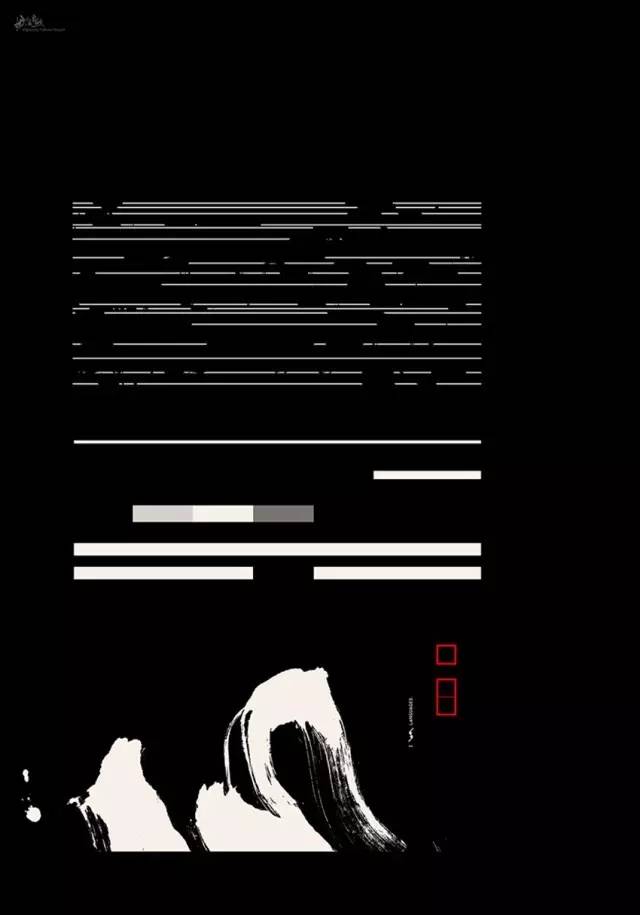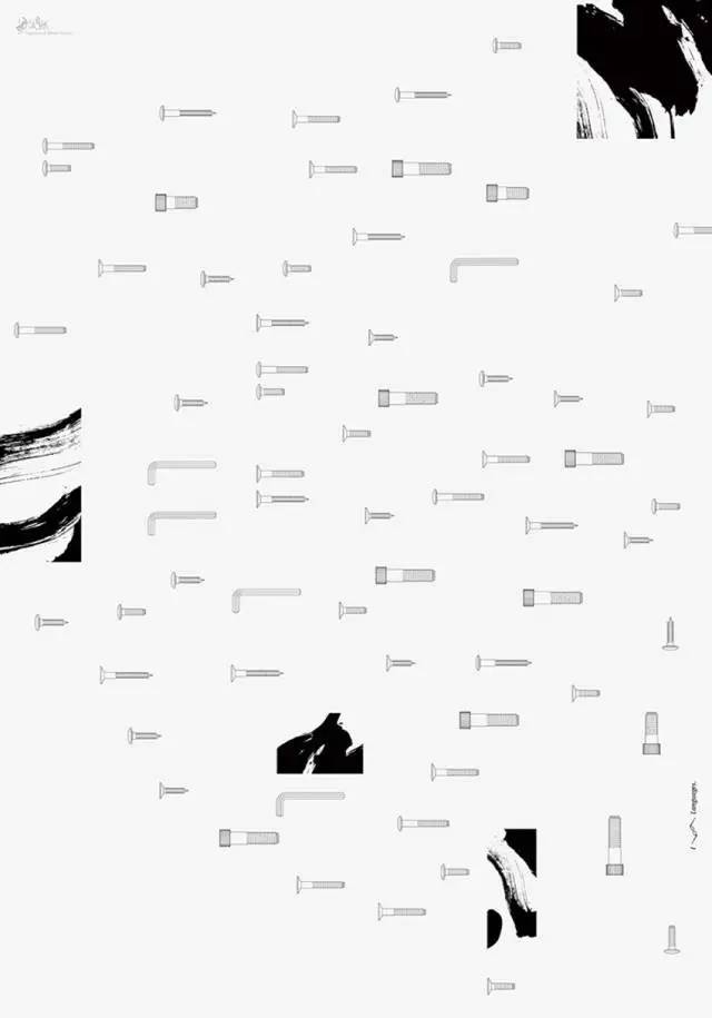 另外一组是在看过董阳孜老师的书法字后,我自行将之转换而成的抽象画面。这幅虽然没有看到她书法的痕迹,但还是保留了水墨的感觉。整张海报结合与简化书法的元素而成(红色矩形符号,也就是书法中经常出现的落款),对我而言,就是书法。最后一幅也是,上面的螺丝钉代表某一个符号的编码,选择放螺丝钉这个元素是因为我手上有刺螺丝钉的刺青,它的意义就是代表我。我们活在当下,无法想像未来的各种可能性;也许书法可以被机械化、未来化、符号化,也许以后的平面设计就会被解码或是编码成这样子。