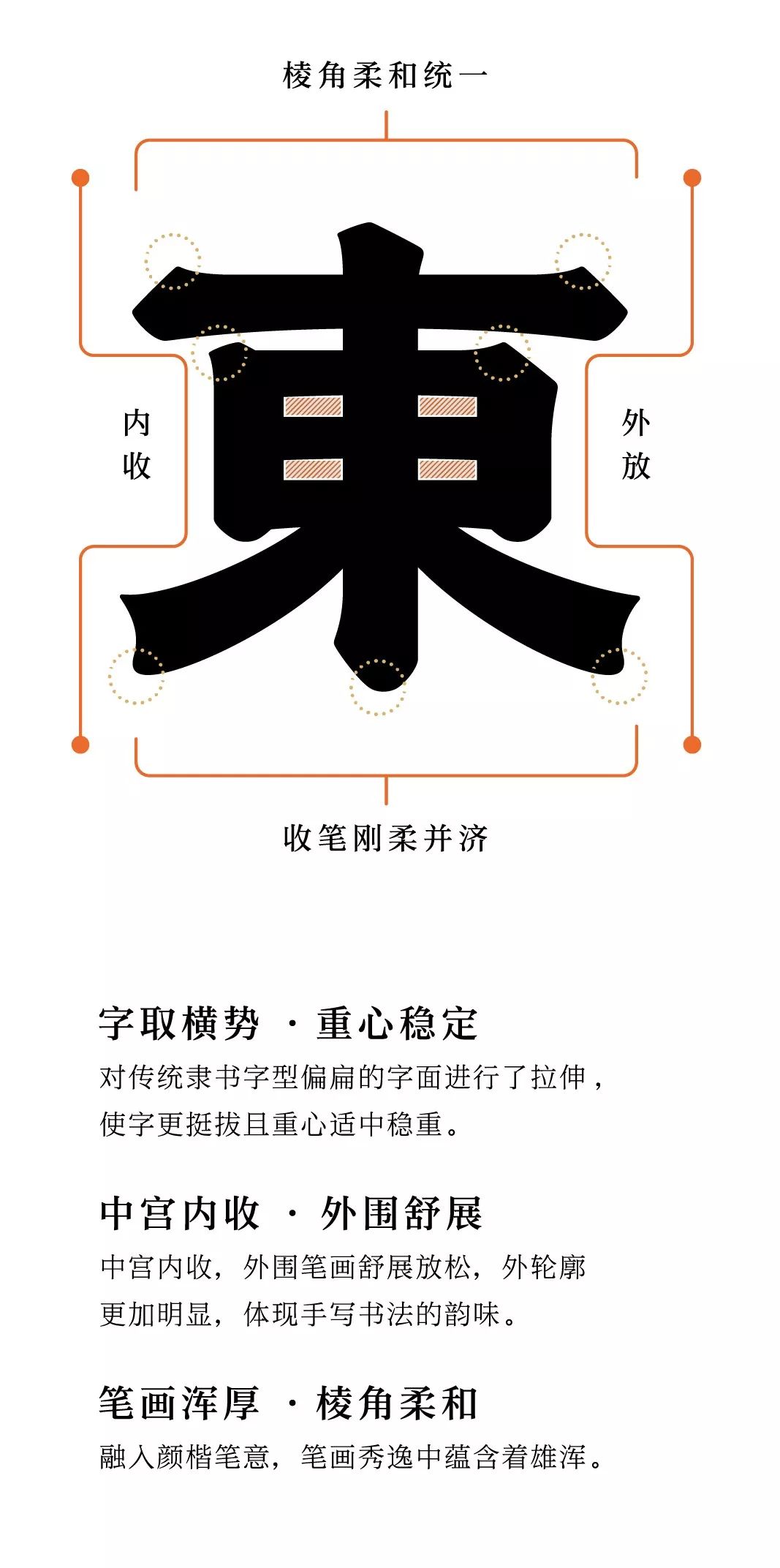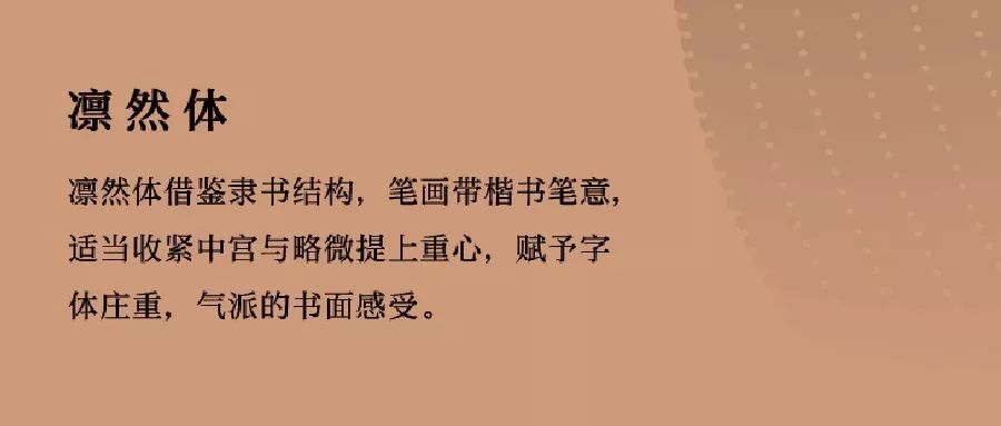 凛然体,借鉴隶书结构,笔画带楷书笔意,适当收紧中宫于略微提上重心,赋予字体庄重,气派的书面感受。