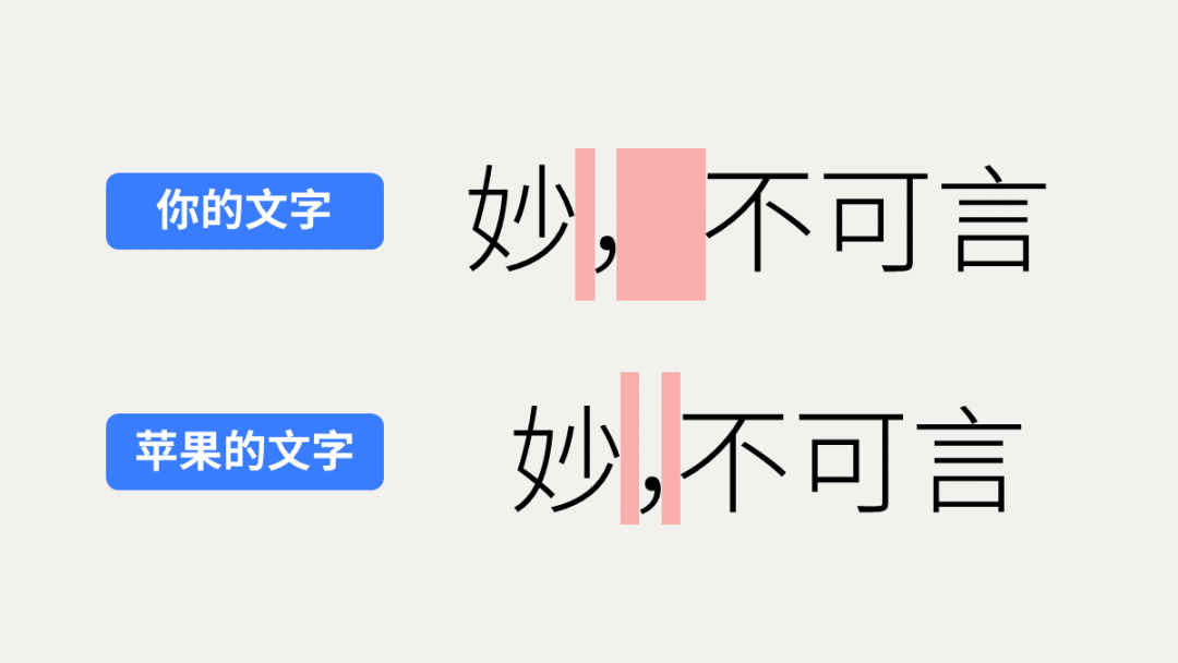 汉字中的标点符号也占一个字符框,但由于标点本身体积小,所以方框内会空出很多空间,最终在视觉上造成“断层”: