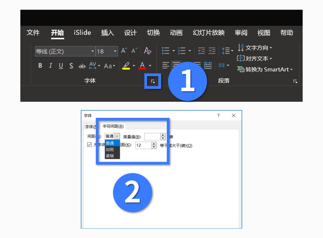 然后点击【开始】-字体菜单栏右下角的【小箭头】-【字符间距】,在【间距】那里可以选择是要【加宽】还是【紧缩】文字的间距,最后在【度量值】那里输入参数即可: