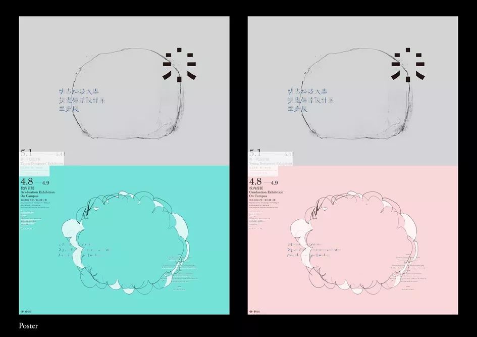 未,如学生的我们,乍看下许多事物混杂不明似一无所有,但也代表着无限可能性。主视觉似面团、云雾感的图形,概念取自还未被制成面包的面团最初(上部)与搓揉后(下部)。在未字上,中空的文字表达「有」与「无」于创作的截然;抽换部分电脑字体笔划,象征透过摸索打破框架的尝试,海报上也借银色油墨特性得移动角度、远近才得以看见文字全貌呼应着主题。白墨覆盖部分图样与资讯,模拟未的迷蒙、暧昧。未,在如隐如现之中。
