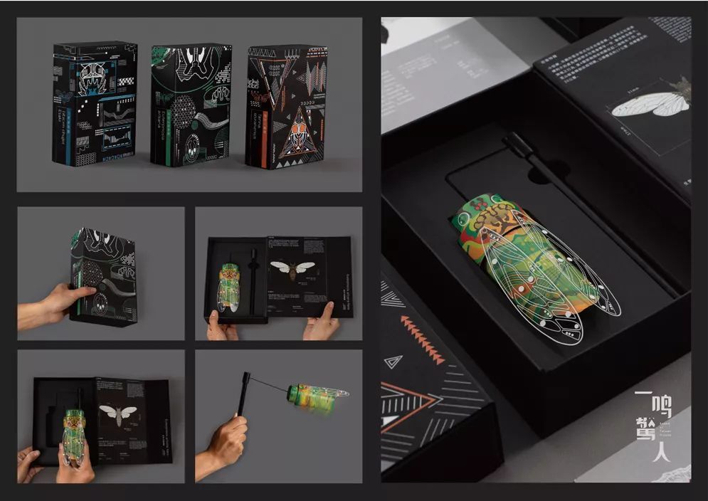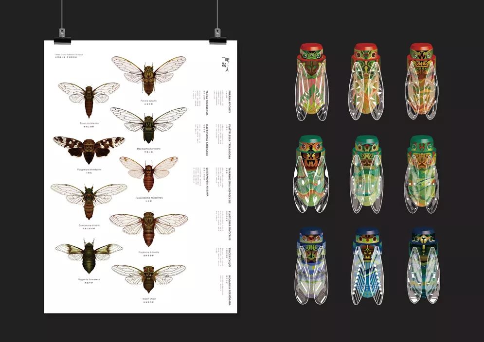 本创作转化传统竹蝉童玩,结合ic晶片与触动装置,设计九只台湾特有种蝉的电子玩具,并将蝉的声音抽象视觉化在玩具涂装上,配合包装与书籍的延伸,期许达到寓教于乐目的。