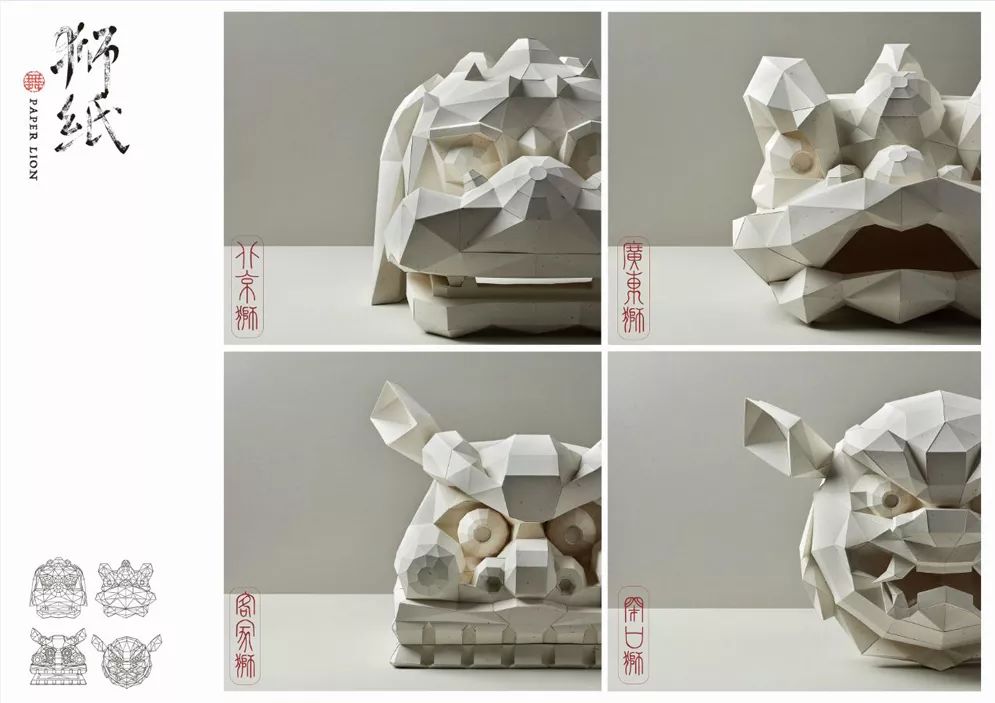 「狮纸」将狮艺与纸艺结合,设计出华人文化特有的创新型纸艺舞狮。受到立体折纸线、面、体造型启发,利用一张张纸即可组成狮头,以最纯净简单的白模体现舞狮工艺之美。