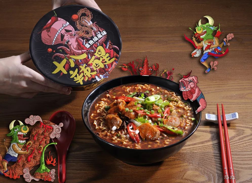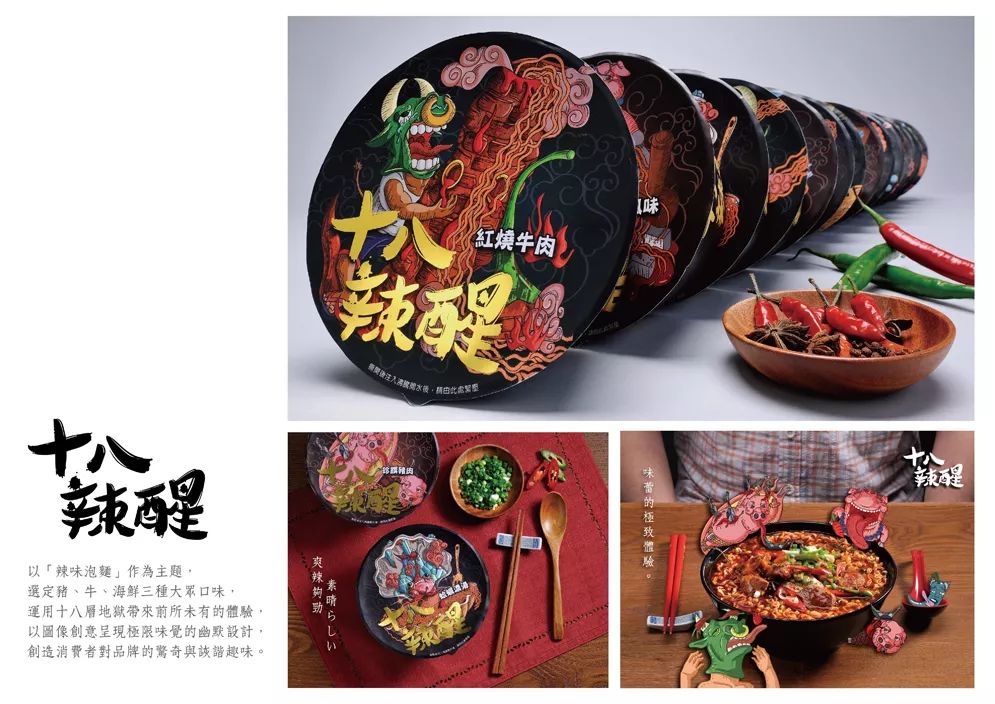 本设计以「辣味泡面」作为主题, 选定猪、牛、海鲜三种大众口味, 以十八层地狱带来前所未有的感受, 以图像创意呈现极限味觉的幽默设计, 创造消费者对品牌的惊奇。