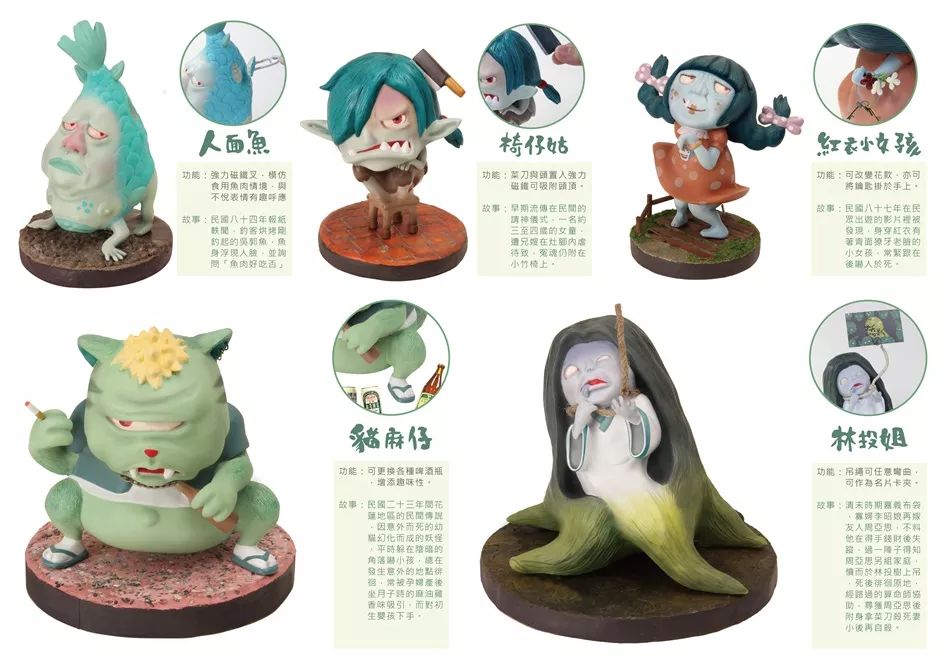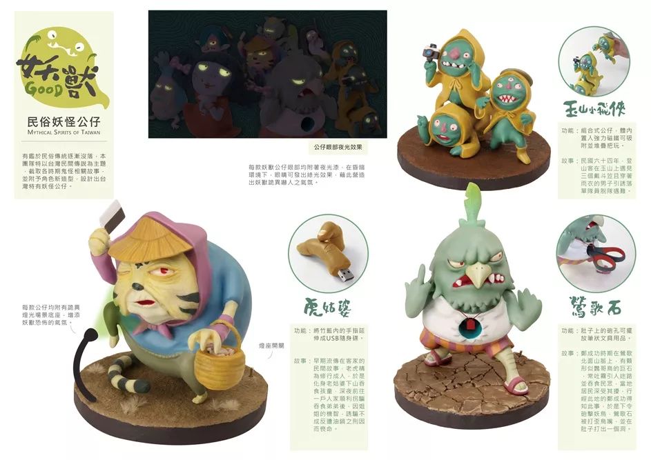 鉴于民俗传统没落,本团队以台湾民间传说为主,截取各时期鬼怪故事并附予角色新造型,以其设计出台湾特有妖怪公仔。本作依故事情境带入趣味动态表情,呈现诡异但不失欢乐气氛,希望让观者对台湾文化有更进步的认识。