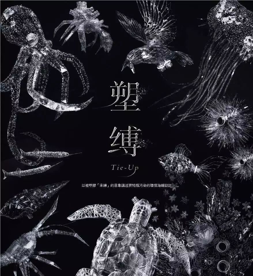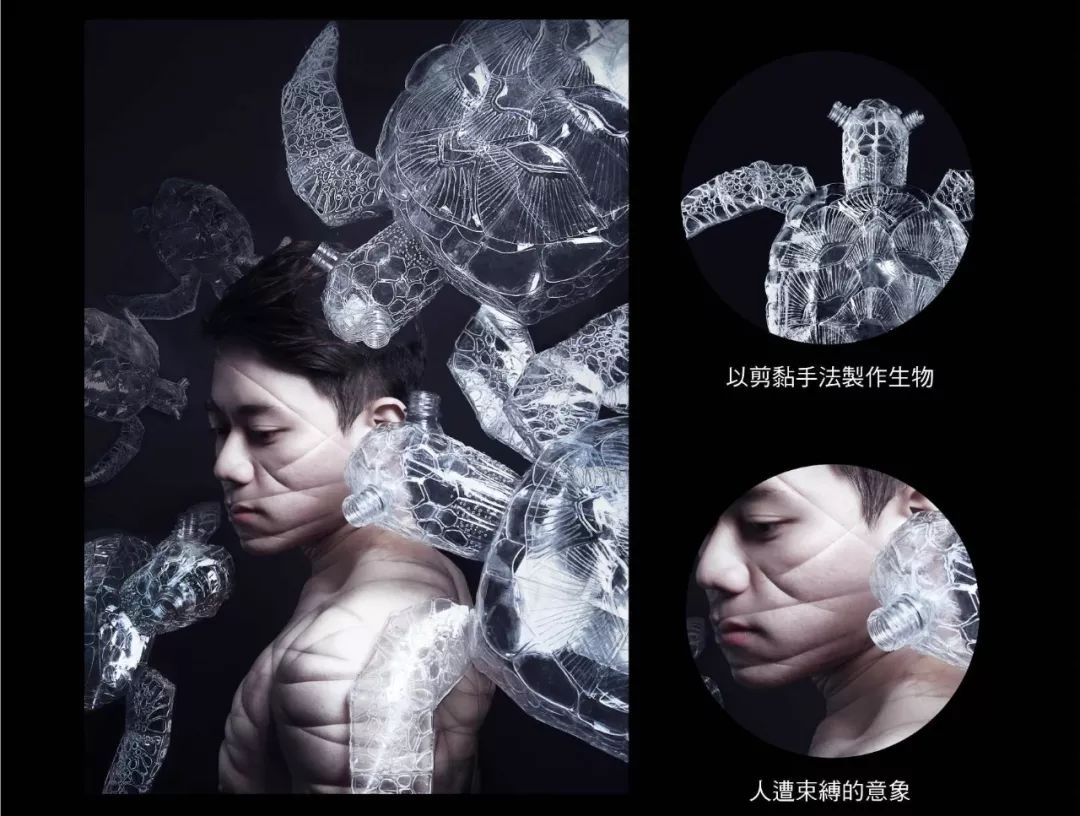 以被塑胶「束缚」的意象讲述宝特瓶污染的环保海报设计。将生活中使用的宝特瓶解构重组,以「缠绕、捆绑与束缚」的概念,来讲述大自然的反噬,重新演绎宝特瓶与人的关系。