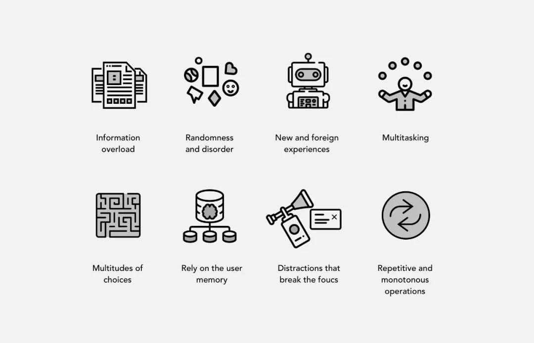 谈到简单性,我们需要提到它的另一面。简单的复杂感是主观的。通过适当的训练,即使学习制造火箭相关知识也不是那么难。但有几个因素甚至使最简单的任务变得复杂。应尽可能避免在产品设计中使用它们:信息过载、无序和混乱、国内外的新经验、多任务处理、多种选择、依赖用户记忆、分散用户的注意力、重复单调的操作