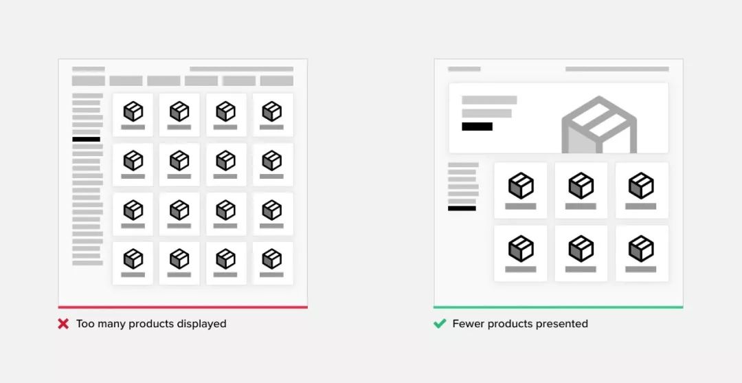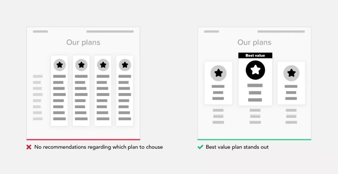 如果无法避免选择,请尝试限制它们。我们应该提供建议或分享其他客户最喜欢的内容的统计数据。清楚地向用户传达建议与选项之间的关键区别。此方法通常用于定价选择页面。