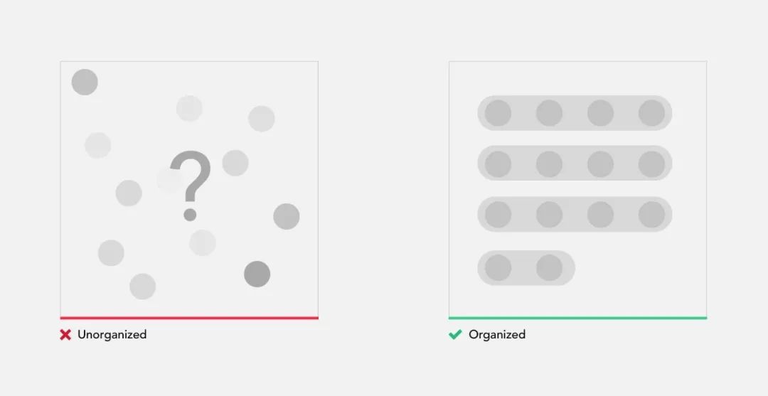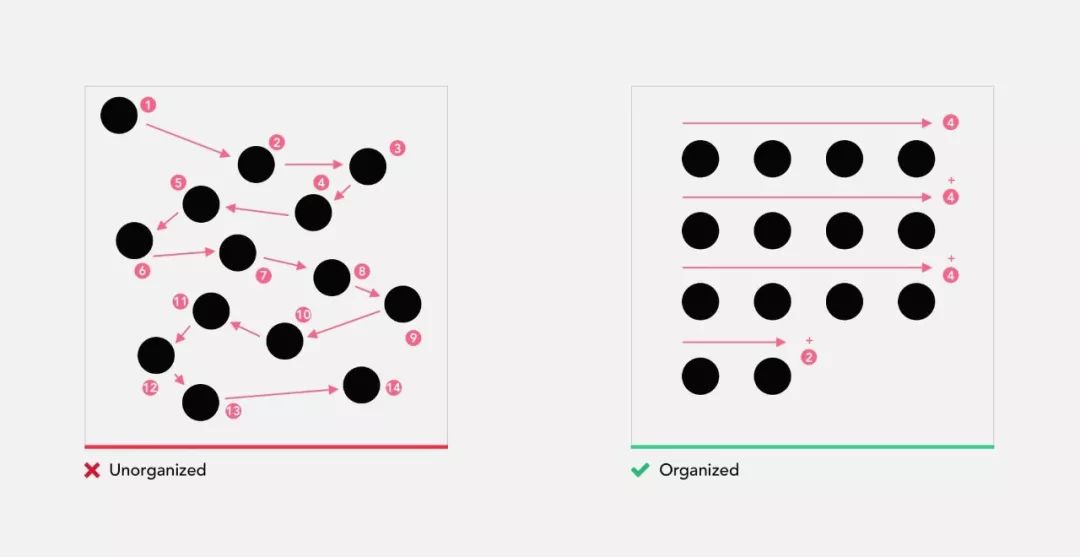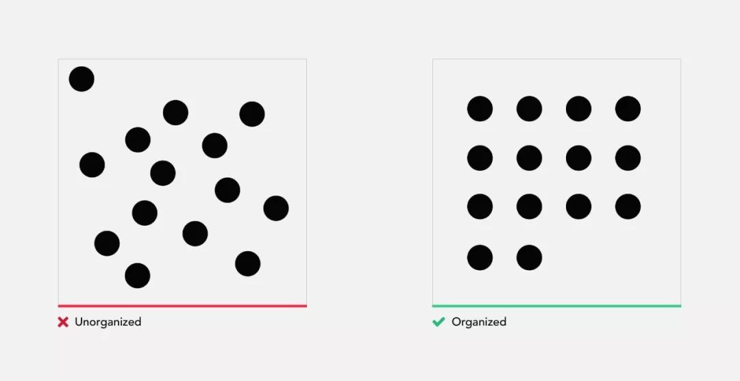 元素的组织不仅提高了识别率,而且更容易记忆。操作任何界面时,记住所有控件的位置和功能非常重要。让我们做另一个小测试。就在一分钟之前,你在计算2幅图像中的点数,现在请回想一下2个方格中每个点的位置。对于大多数人来说,无组织的结构记住几乎是不可能的。