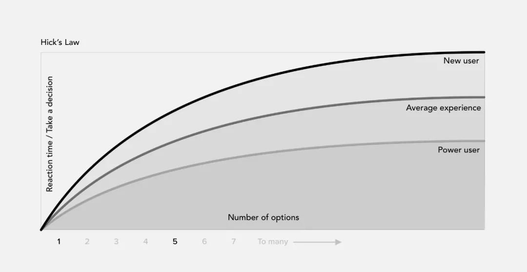 一个人所面临的选择越多,做出选择所花的时间就越多,当面临选择的数量增加,做出决定的时间也会跟着增加。这就是希克定律。如果想减少用户的反应时间和错误概率,请减少选项。因此,如果你希望自己的用户体验变得简单,则需要帮助用户尽可能快速地制定决策。
