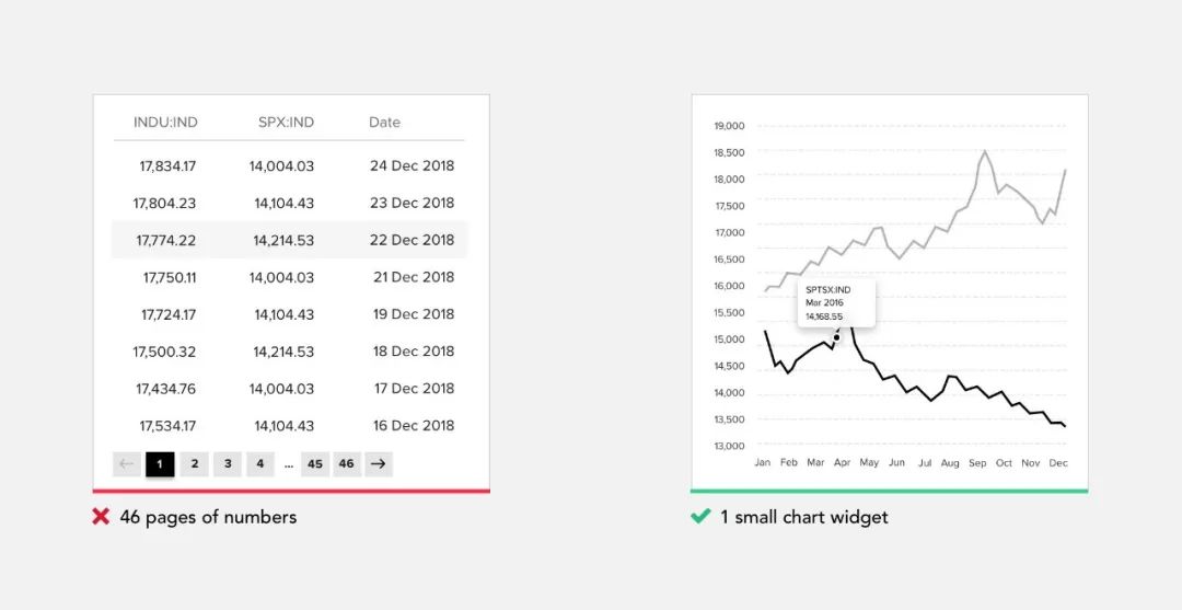 我们设计的大多数产品都集中在用户需要理解的大数据上,以便他们有效地执行日常工作。当你了解对趋势和变化感兴趣的用户时,请使用可视化设计表示而不是一堆数字来帮助他们。你始终可以显示其他信息。尝试从你拥有的数据中提取有意义的数据并将其放在用户面前。