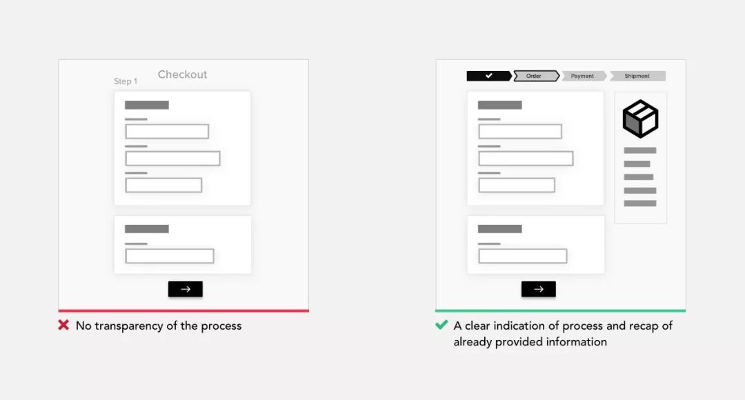 不确定性使用户焦虑,应尽可能避免。这就是为什么在任何时候除非显而易见,否则用户应该能够看到他目前在哪里,他来自哪里以及接下来会去往哪里。保存先前提供的信息摘要也是一个好主意,它降低了用户记忆负荷,并且无需返回仔细检查先前的步骤。