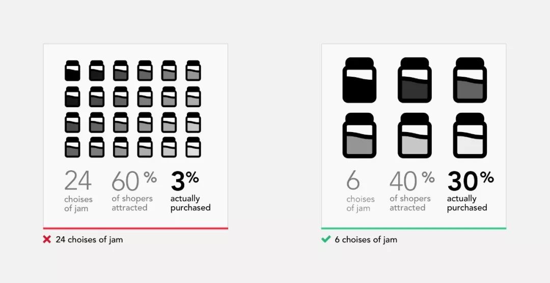 这个实验似乎证明,与那些有很多选择的客户相比,选择较少的客户购买的可能性要高10倍。有时为客户提供太多选择的想法实际上会抑制客户购买。
