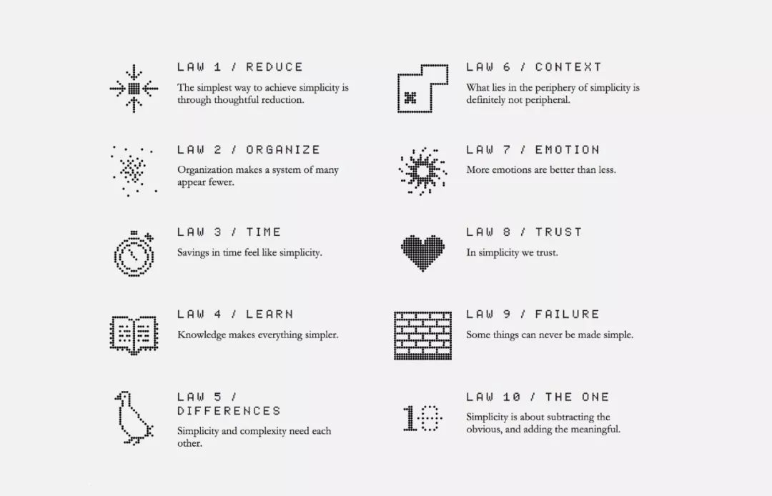 解决用户实现目标的困难并帮助他实现简单化。在“简单法则”中,John Maeda提供了十项原则,用于平衡业务、技术和设计的简单性和复杂性。