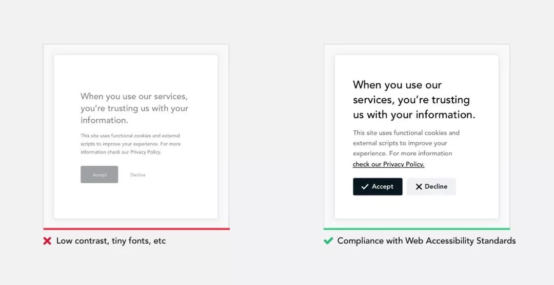 作为设计师你的目标是支持可访问性,确保你的产品可以被更多受众访问。全世界有超过10亿人患有残疾。不要使用颜色作为传达信息的唯一视觉手段。确保文本与其背景之间有足够的对比度,支持键盘导航等。可访问性不局限于具有不同能力的一组用户,当你设计可访问性时,你可以改善使用该产品的每个人的用户体验。