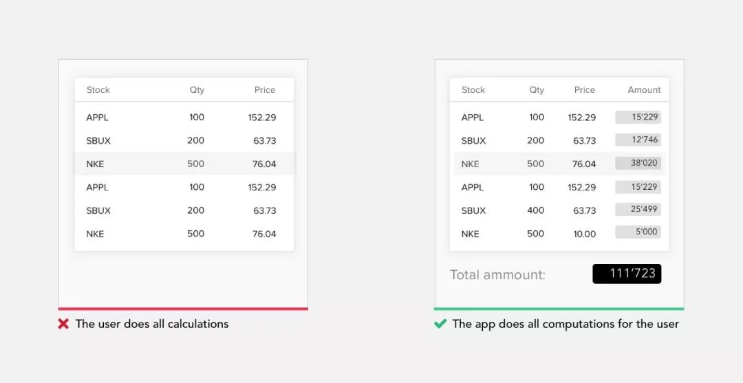 人脑在涉及数字的算术运算时,3+8的结果都能脱口而出,而128+346的结果就需要花更多的时间进行计算。所以在涉及到数字类的产品中尝试利用系统来代替用户进行所有计算。