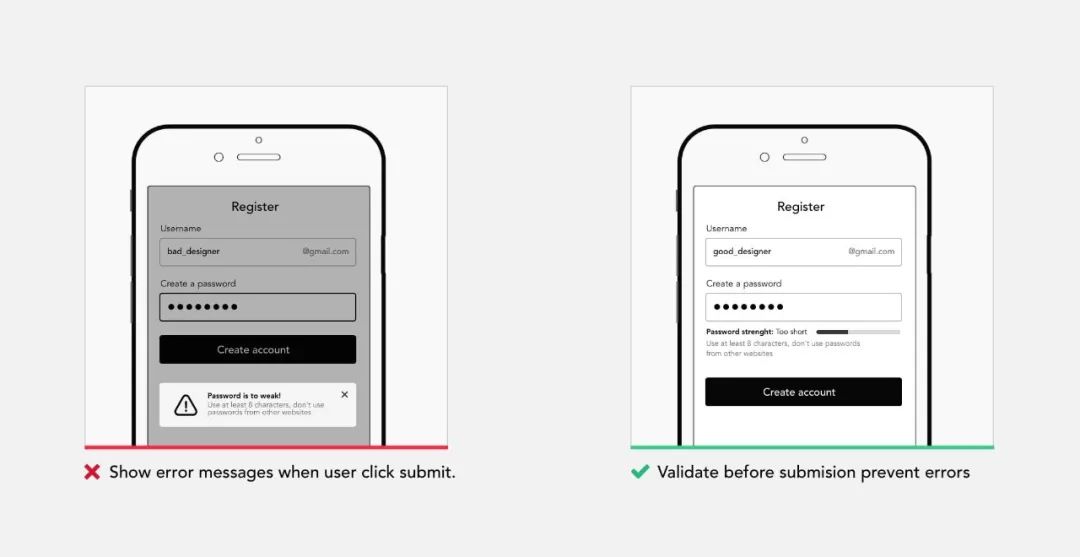 错误消息会带给用户很多压力,让用户感觉他们搞砸了或者没有完成任务。确保自动检查输入的数据,并为不适当的数据输入提供警报或提醒,以减少错误。要么减少容易出错的情况,要么检查它们并在用户提交操作之前向用户显示确认选项。应该通过强制功能来保护不可恢复的行为,以确保用户意识到他们的选择带来的影响。