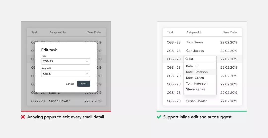 删除所有不必要的交互、视图和多于步骤。用户应该以最佳速度操作系统,它称为“流动状态”。不要用弹窗打破这种流程。对于以后可以更改的所有操作,请尽可能支持内联编辑。当有大量值可自动筛选提示值。