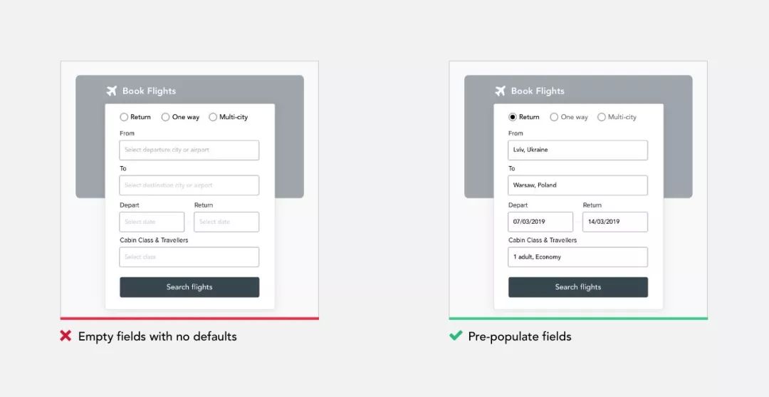 系统默认设置是为你提供问题答案的选择。这方便用户更快地完成表单。填写表格要求他们对其进行解析,然后将他们的答案输入表格中并保证输入信息的可用性。定义相关默认值时,设计人员需要了解用户以及他们使用产品的场景。只有深入研究和测试才能实现这一点,向用户学习并根据用户的历史数据和使用场景调整默认值。始终将默认值设置为绝大多数用户能做出明确选择的选项。