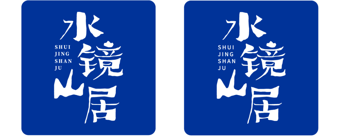 2,“水镜山居”,是一家民宿,中文设计的风格,是偏手写的感觉,在拼音的字体选择上,左图,是衬线体,右图,是非衬线体。