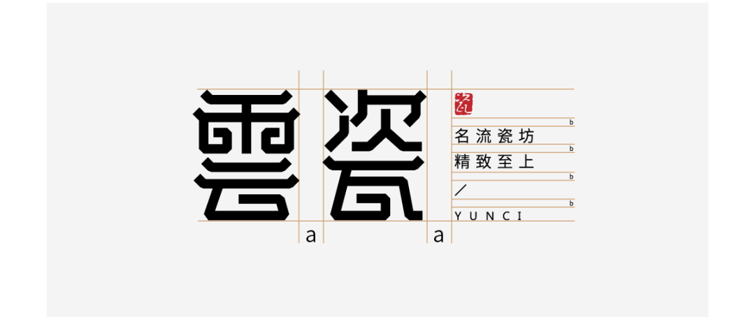 在上图中,雲瓷两字的间距,以及瓷字与右侧几个元素的间距,宽度是保持一致的,距离都是“a”。而单独分析右侧几处元素,从上而下,分别是印章、slogan、斜线、拼音,这四部分,其间距也基本保持一致,距离都是“b”。