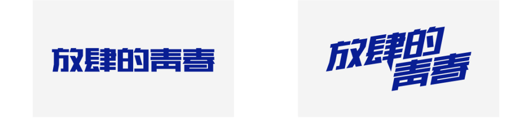 而右图,这样的格式就明显好了很多,“野”了很多,首先,根据字体内容,把文字分两行排列,这样看起来会更有节奏感,接着,再进行右倾斜和上倾斜的处理,让字体往上“冲”,更有冲击力。