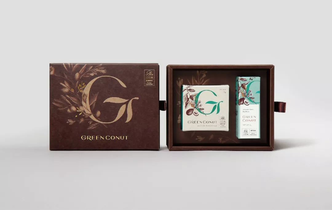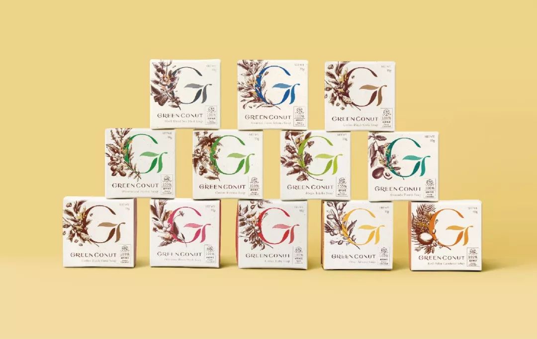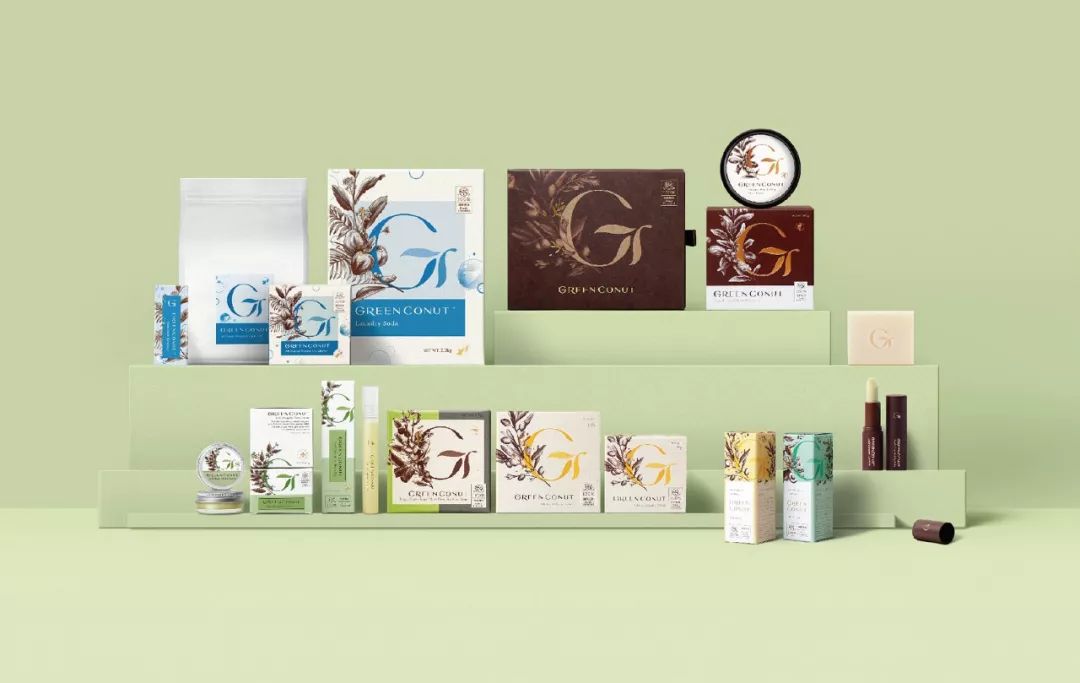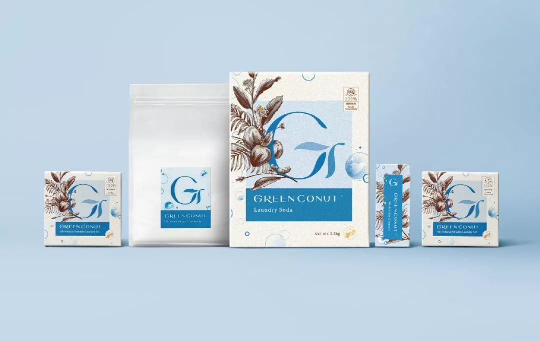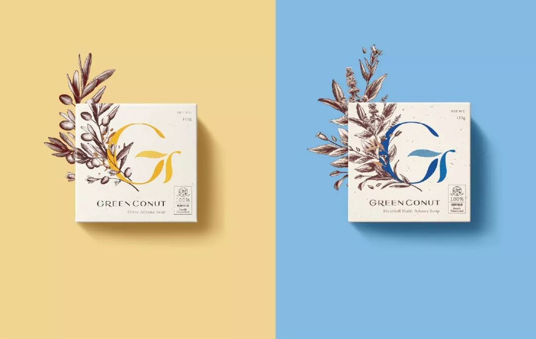 辅助图形以丰富的自然植物为主,环绕著品牌识别标志「G」,各类植物向上蔓延生长,表现出绿果企业「蓬勃发展、旭日东昇」之意象。并延伸至多元产品包装并与系列产品特色结合,创造符合产品属性与识别一致性的形象视觉。而品牌主色系为绿色,绿色代表清新、健康、自然、永续、赋原与归真。并将「回归本味-纯粹无香」贯彻于整体绿果新的品牌形象裡,同时也以此概念出发,打造了GREEN CONUT 品牌整体新的样貌。