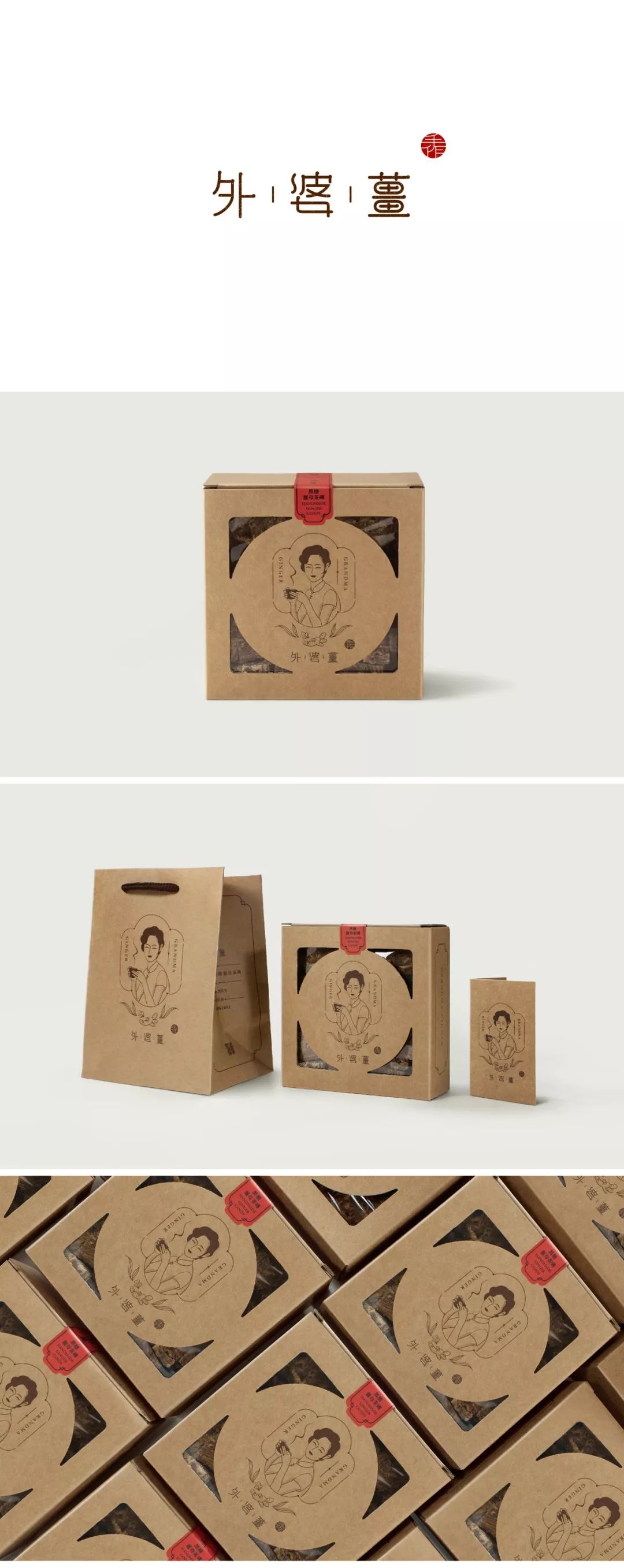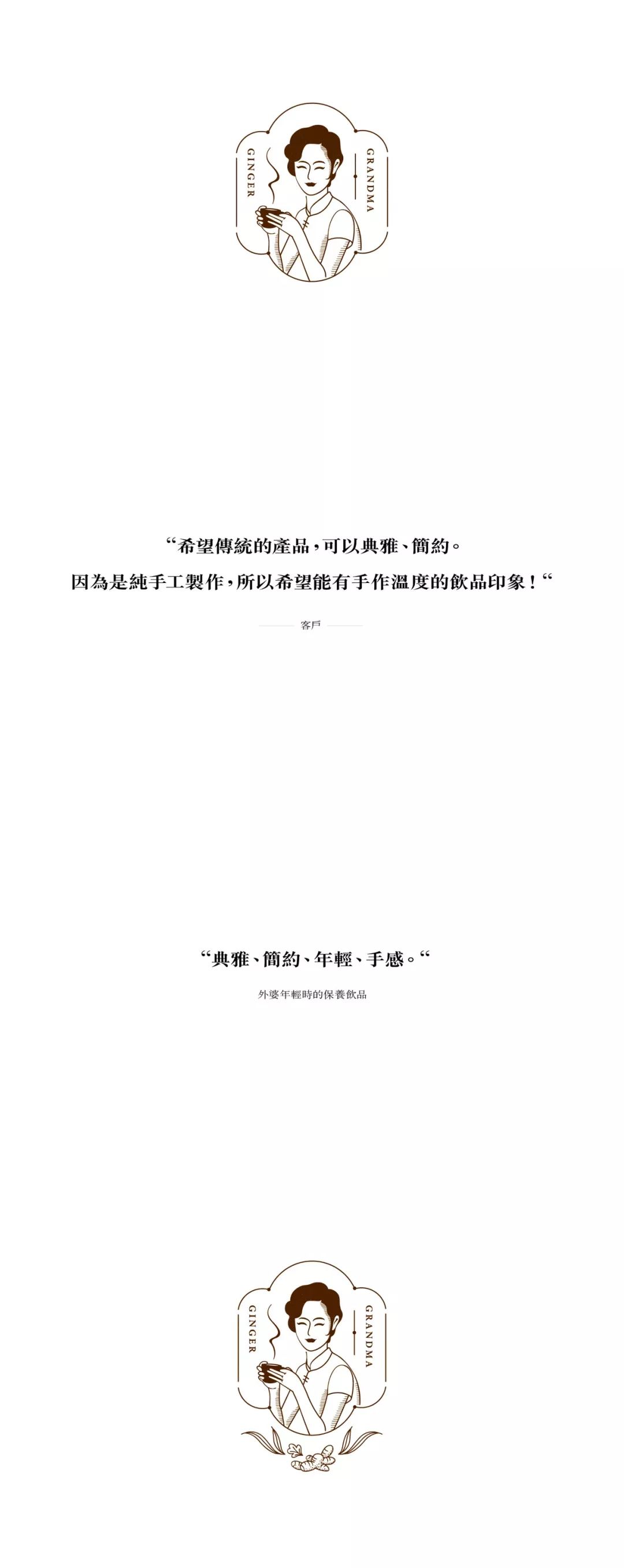 外婆薑的品牌标志是以年轻时期的外婆为主要造型,运用复古的怀旧时光搭配现代的手绘风格,宛若进入时光隧道,不仅让人置身于民国初年的意境,更融入古典朴实的淡雅,并赋予了现代新颖的品牌风貌。
