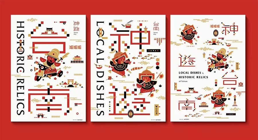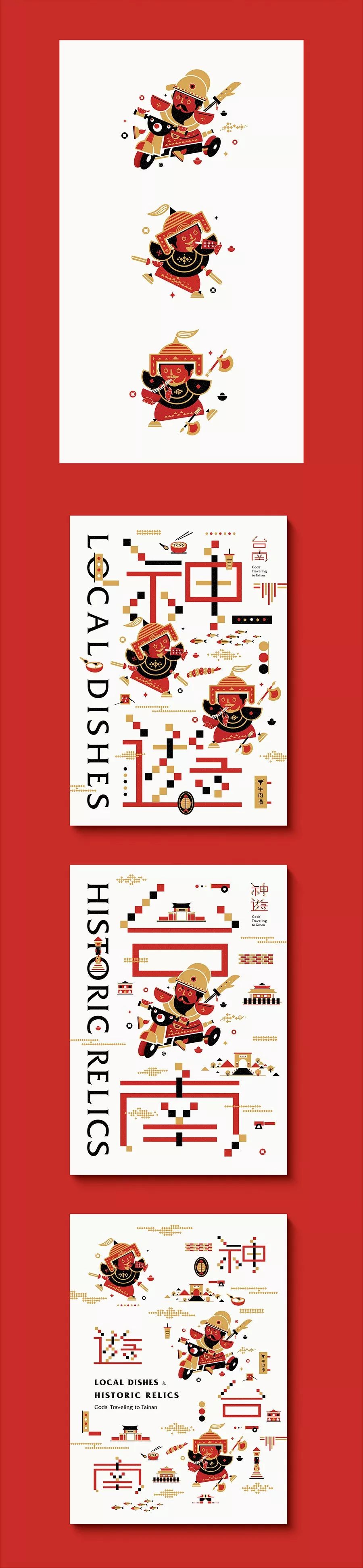 为使台南观光业与大众更亲密,设计师定位台南的新形象时,决定以趣味幽默的方式切入,也就是「神游台南」为核心概念,而这裡运用「神游」的谐音,以「神明游历」的幽默视觉手法呈现,让观赏者有「想像游历」的感觉,达到巧妙性的连结。以骑机车游古城的「关帝爷」和手拿美食小吃的「门神」为主角,用诙谐风趣介绍台南的文化特色。展览时,设计师使用「光栅原理」的立体影像层次感,创造视觉立体深度,也增加变图视觉的趣味性。以「现代简约」的几何图形,既有融和「传统」和「现代」风格的意涵,也彰显出设计师让台南古城贴近年轻族群的企图心。