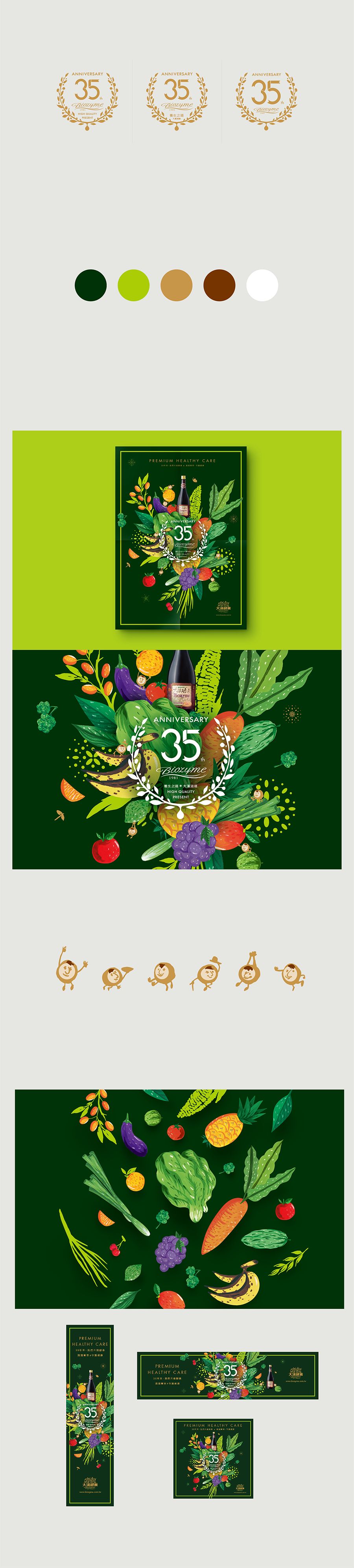 蔬果是来自大地最缤纷美好的礼物,设计师以插画风格为主要设计,运用丰富蔬果插画的视觉效果来呈现出週年庆的欢庆缤纷,品牌主调绿色搭配金色表现出「专业」、「珍贵」和「健康」的形象。设计中还加入了可爱有趣的酵素宝宝,让品牌形象多了一份亲近感和趣味性。