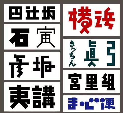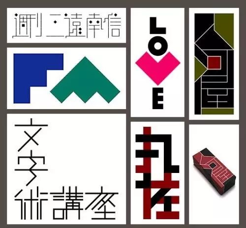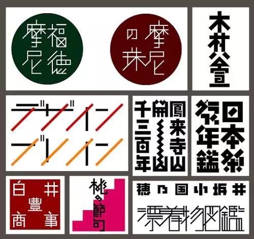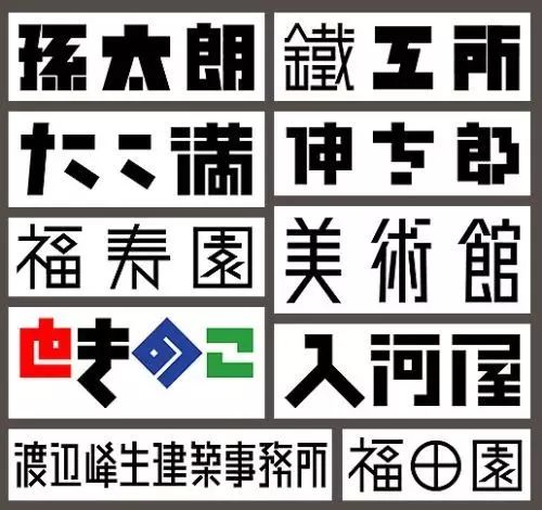 味冈伸太郎的字体设计,有一种极有张力的古朴与简洁,风格十分独特。粗看上去,一切似乎都那麼的随意。特有风格的笔画元素、中宫结构、色彩搭配……这也是其设计的最大特点所在,貌似随意却寻求动态之中的统一,以及从平面构成角度去看的虚实关係。每个字体中的相同笔画的处理并不完全相同,但从整体上看倒是统一和谐的。