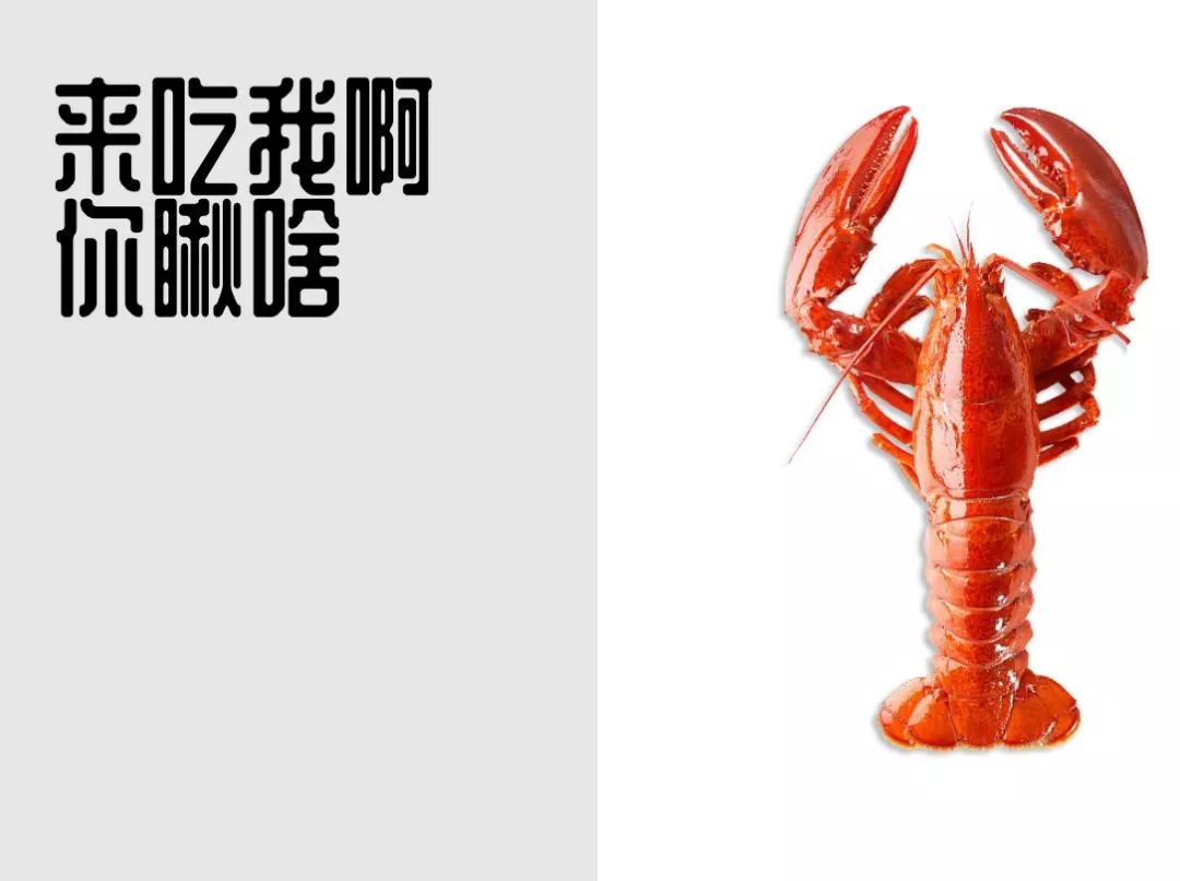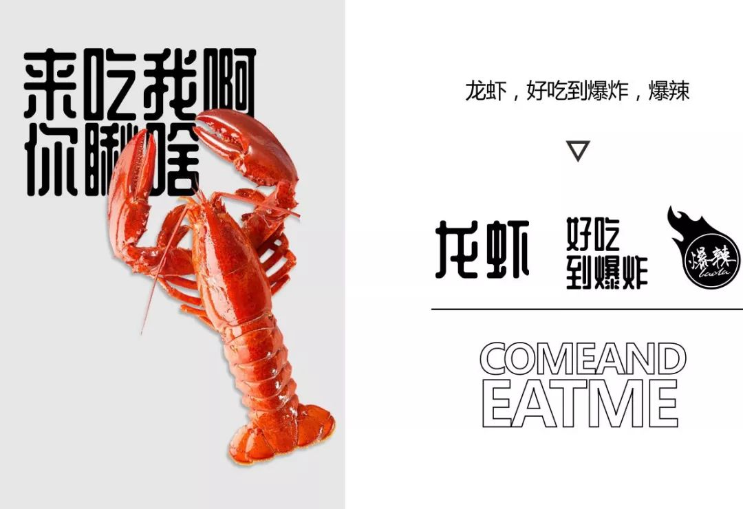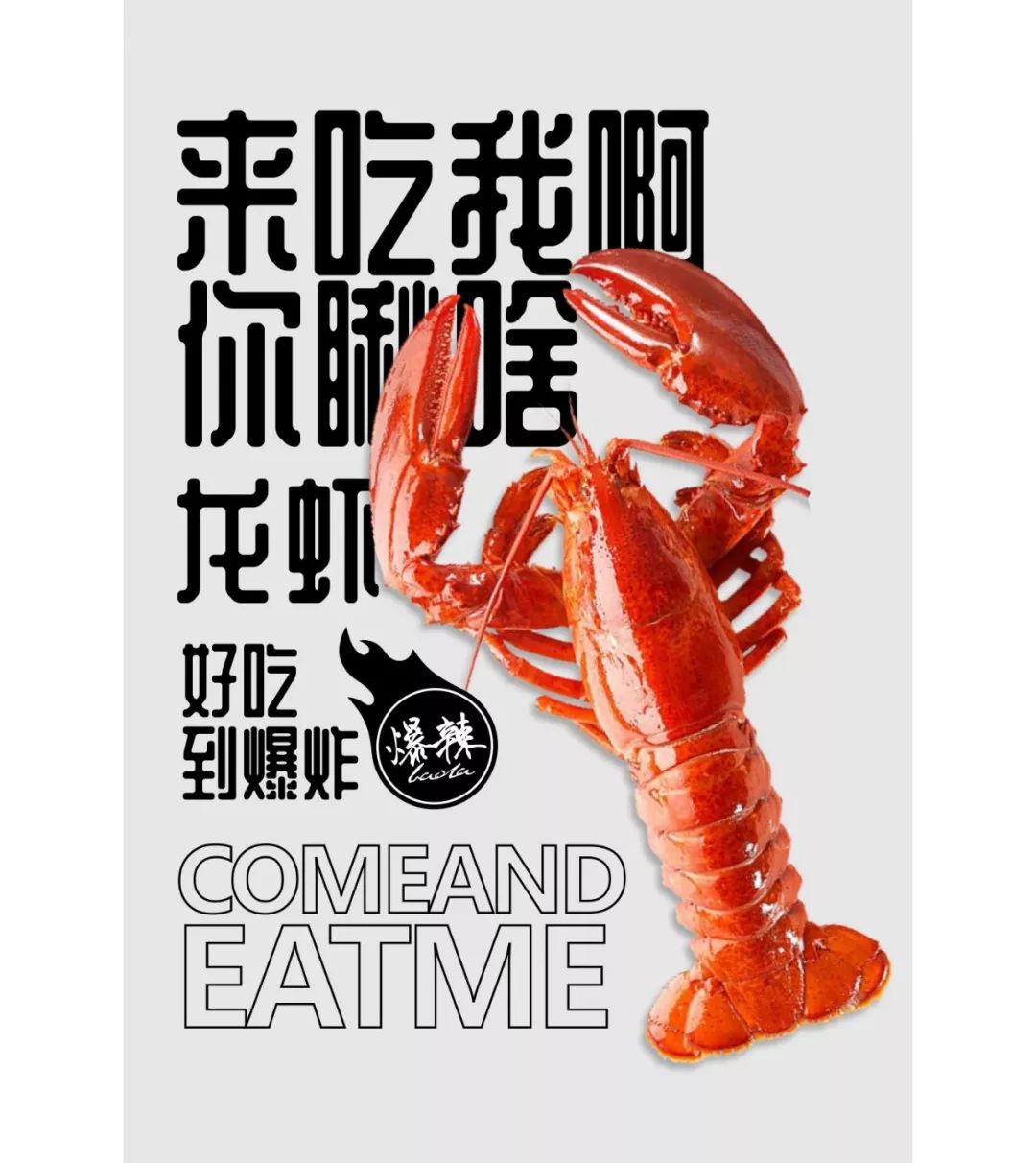 主标题放好之后,我们将小龙虾放在版面右方空白处,并对它进行角度旋转,更灵动些,同时我们将剩下的文字信息做个层级对比,把主标题翻译成英文,接着做符号化处理。