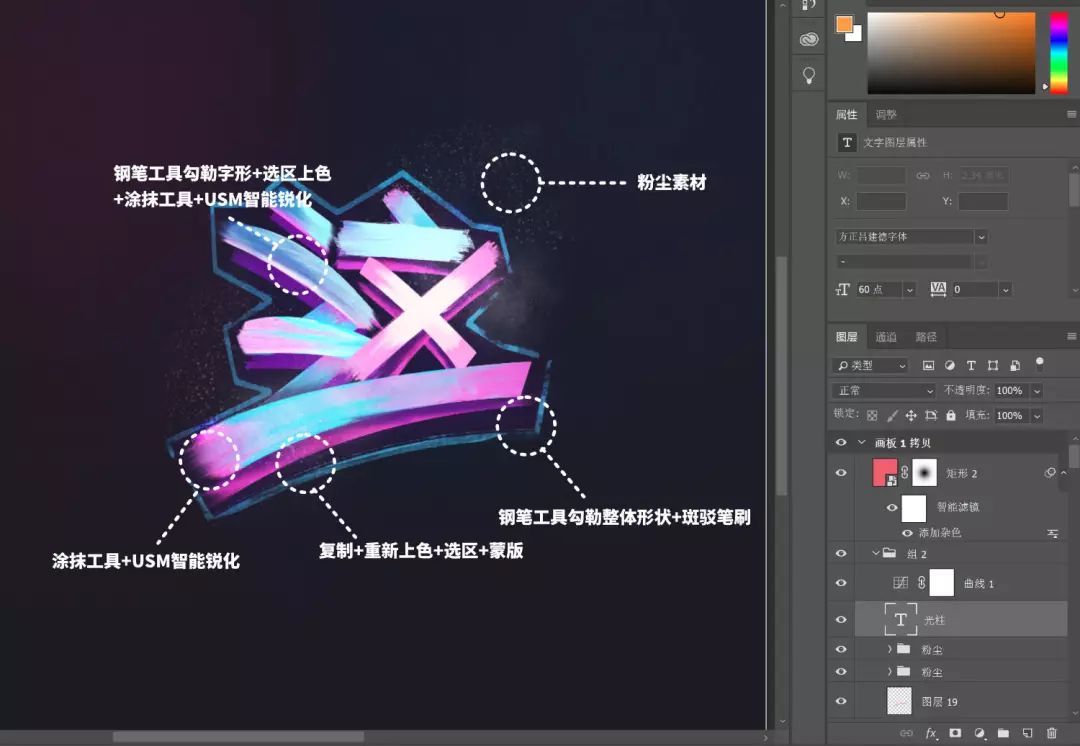 想实现也不难,就是在字形的基础上,用画笔和涂抹工具刷出来,有耐心一点就好。