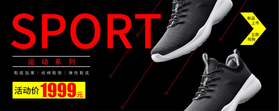 这是一个鞋子的广告,从红黑的配色,以及斜线等装饰元素的运用,我们可以看出来他是想表现出运动的感觉。