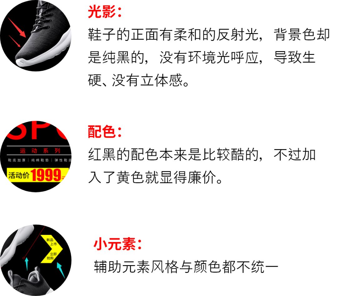整个画面有些乱,我们来看看这张广告在细节处理上的问题: